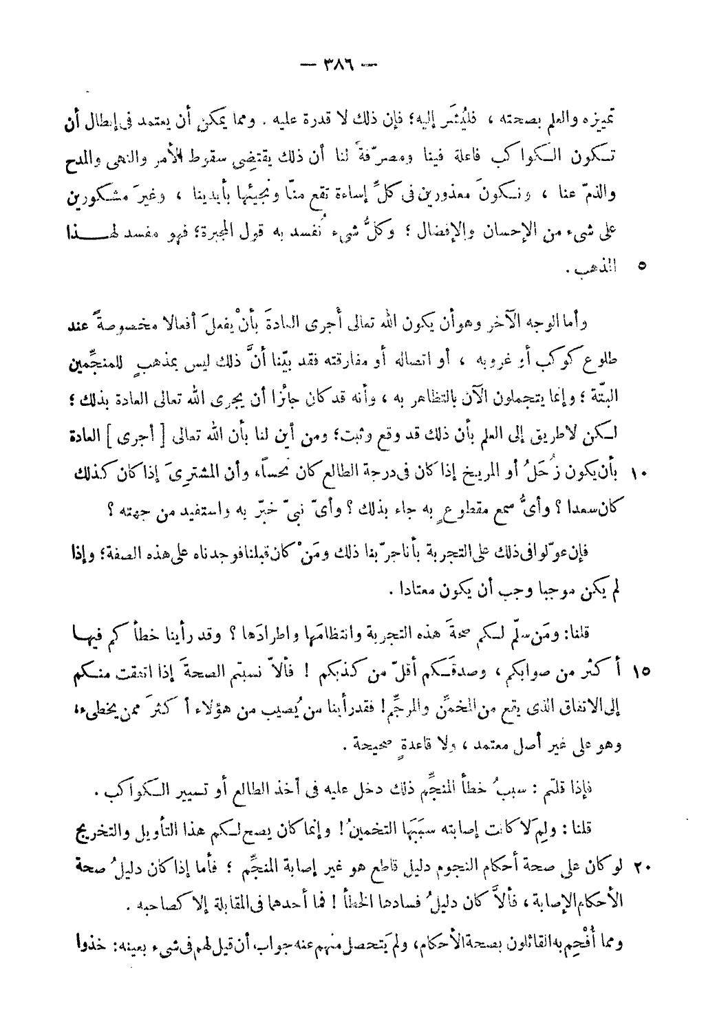 وأما الوجه الآخر وهو أن يكون الله تعالى أجرى العادة بأن يفعل أفعالا مخصوصة عند طلوع كوكب أو غروبه، أو اتصاله أو مفارقته فقد بيّنا أنّ ذلك ليس بمذهب للمنجّمين البتّة؛ وإنما يتجملون الآن بالتظاهر به، وأنه قد كان جائزا أن يجرى الله تعالى العادة بذلك؛ لكن لا طريق إلى العلم بأن ذلك قد وقع وثبت؛ ومن أين لنا بأن الله تعالى [أجرى] العادة بأن يكون زحل أو المريخ إذا كان فى درجة الطالع كان نحسا، وأن المشترى إذا كان كذلك كان سعدا؟ وأىّ سمع مقطوع به جاء بذلك؟ وأىّ نبىّ خبّر به واستفيد من جهته؟