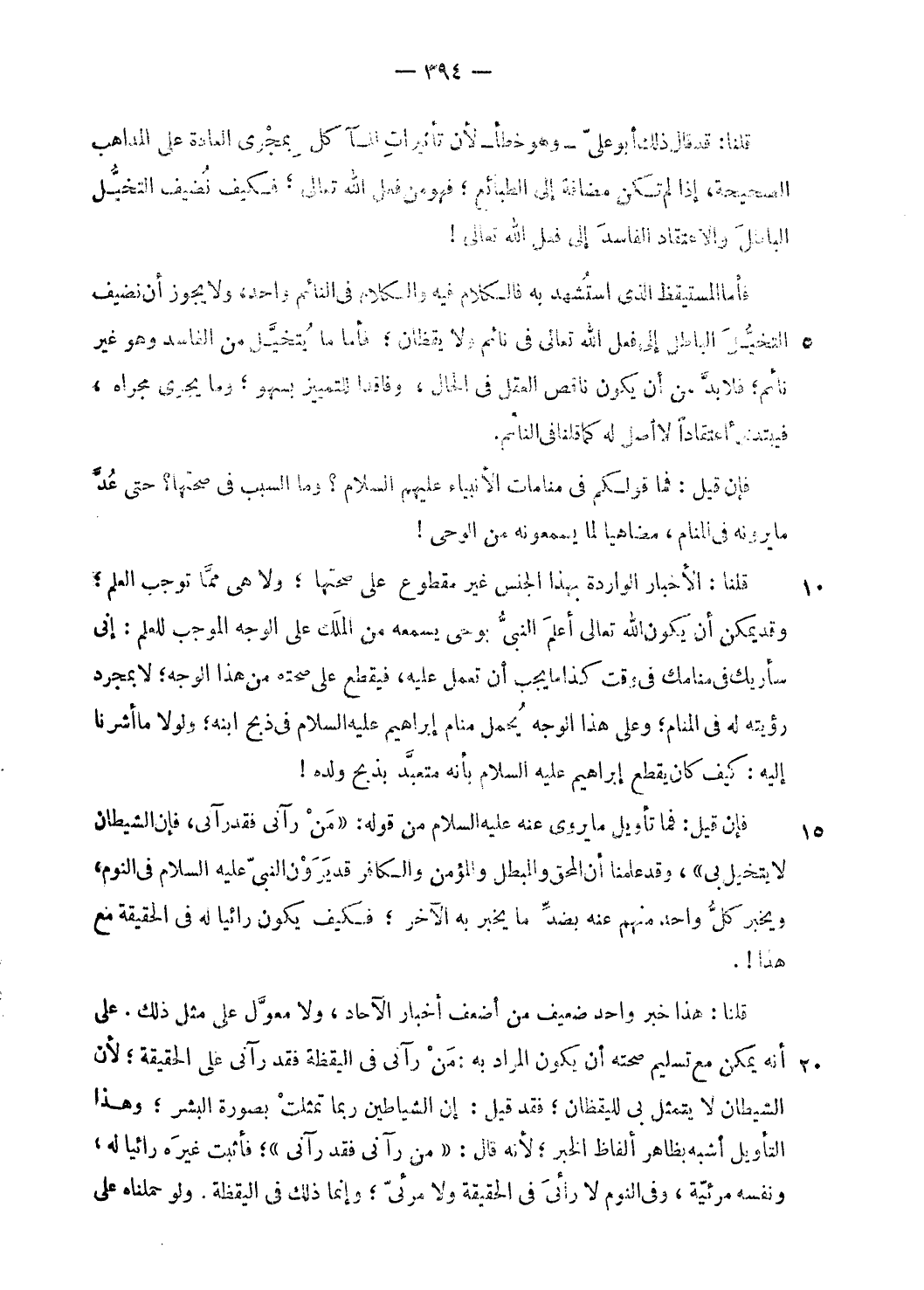 فأما المستيقظ الّذي استشهد به فالكلام فيه والكلام فى النائم واحد، ولا يجوز أن نضيف التخيّل الباطل إلى فعل الله تعالى فى نائم ولا يقظان؛ فأما ما يتخيّل من الفاسد وهو غير نائم؛ فلا بدّ من أن يكون ناقص العقل فى الحال، وفاقدا للتمييز بسهو؛ وما يجرى مجراه، فيبتدئ اعتقادا لا أصل له كما قلنا فى النائم.