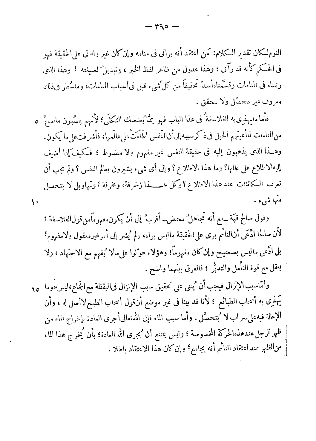 وأمّا سبب الإنزال فيجب أن يبنى على تحقيق سبب الإنزال فى اليقظة مع الجماع، ليس هو ما يهذى به أصحاب الطبائع؛ لأنا قد بينا فى غير موضع أن قول أصحاب الطبع لا أصل له، وأن الإحالة فيه على سراب لا يتحصّل. وأما سبب الماء فإن الله تعالى أجرى العادة بإخراج الماء من ظهر الرجل عند هذه الحركة المخصوصة؛ وليس يمتنع أن يجرى الله العادة؛ بأن يخرج هذا الماء من الظهر عند اعتقاد النائم أنه يجامع؛ وإن كان هذا الاعتقاد باطلا.