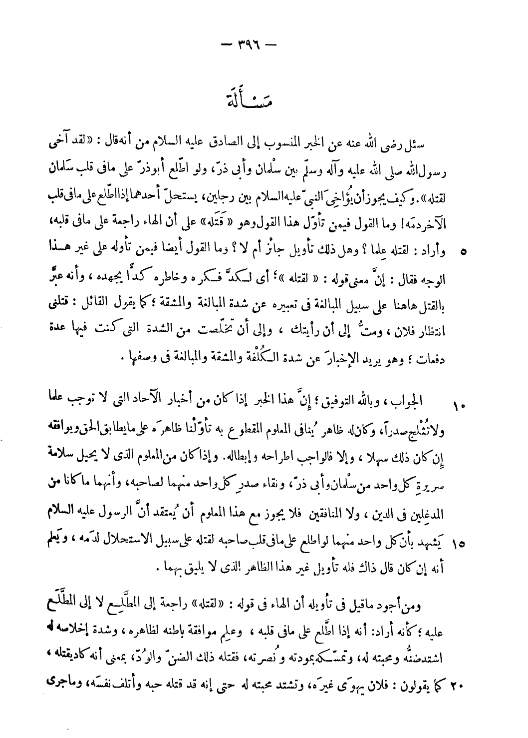 سئل رضى الله عنه عن الخبر المنسوب إلى الصادق عليه السلام من أنه قال: «لقد آخى رسول الله صلى الله عليه وآله وسلّم بين سلمان وأبى ذرّ، ولو اطّلع أبو ذرّ على ما فى قلب سلمان لقتله». وكيف يجوز أن يؤاخى النبىّ عليه السلام بين رجلين، يستحلّ أحدهما إذا اطّلع على ما فى قلب الآخر دمه! وما القول فيمن تأوّل هذا القول وهو «قتله» على أن الهاء راجعة على ما فى قلبه، وأراد: لقتله علما؟ وهل ذلك تأويل جائز أم لا؟ وما القول أيضا فيمن تأوله على غير هذا الوجه فقال: إنّ معنى قوله: «لقتله»؛ أى لكدّ فكره وخاطره كدّا يجهده، وأنه عبّر بالقتل هاهنا على سبيل المبالغة فى تعبيره عن شدة المبالغة والمشقة؛ كما يقول القائل: قتلنى انتظار فلان، ومتّ إلى أن رأيتك، وإلى أن تخلّصت من الشدة التى كنت فيها عدة دفعات؛ وهو يريد الإخبار عن شدة الكلفة والمشقة والمبالغة فى وصفها.