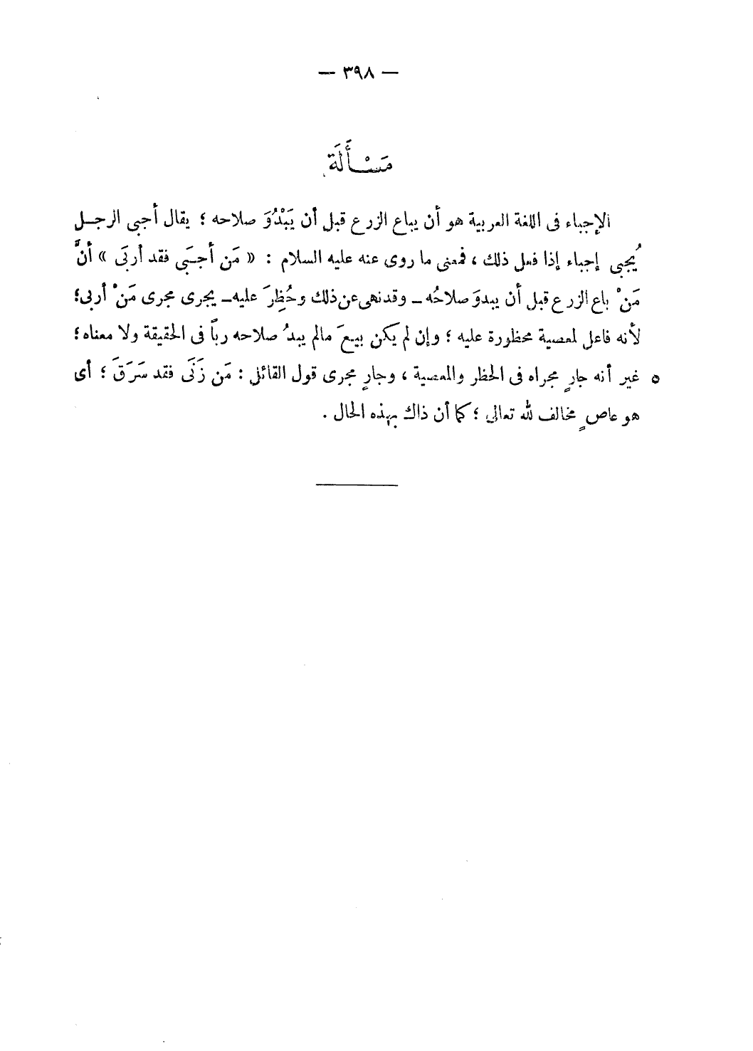 الإجباء فى اللغة العربية هو أن يباع الزرع قبل أن يبدو صلاحه؛ يقال أجبى الرجل يجبى إجباء إذا فعل ذلك، فمعنى ما روى عنه عليه السلام: «من أجبى فقد أربى» أنّ من باع الزرع قبل أن يبدو صلاحه- وقد نهى عن ذلك وحظر عليه- يجرى مجرى من أربى؛ لأنه فاعل لمعصية محظورة عليه؛ وإن لم يكن بيع ما لم يبد صلاحه ربا فى الحقيقة ولا معناه؛ غير أنه جار مجراه فى الحظر والمعصية، وجار مجرى قول القائل: من زنى فقد سرق؛ أى هو عاص مخالف لله تعالى؛ كما أن ذاك بهذه الحال.