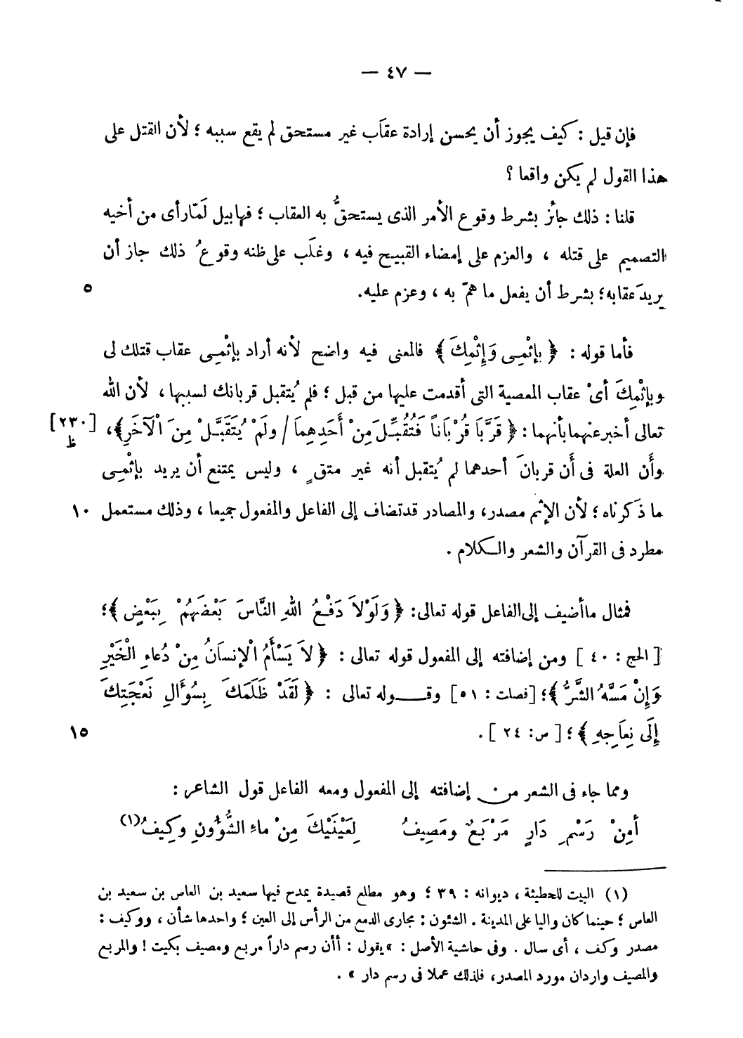 فأما قوله: بِإِثْمِي وَإِثْمِكَ فالمعنى فيه واضح لأنه أراد بإثمى عقاب قتلك لى وبإثمك أى عقاب المعصية التى أقدمت عليها من قبل؛ فلم يتقبل قربانك لسببها، لأن الله تعالى أخبر عنهما بأنهما: قَرَّبا قُرْباناً فَتُقُبِّلَ مِنْ أَحَدِهِما/ وَلَمْ يُتَقَبَّلْ مِنَ الْآخَرِ، وأن العلة فى أن قربان أحدهما لم يتقبل أنه غير متق، وليس يمتنع أن يريد بإثمى ما ذكرناه؛ لأن الإثم مصدر، والمصادر قد تضاف إلى الفاعل والمفعول جميعا، وذلك مستعمل مطرد فى القرآن والشعر والكلام.