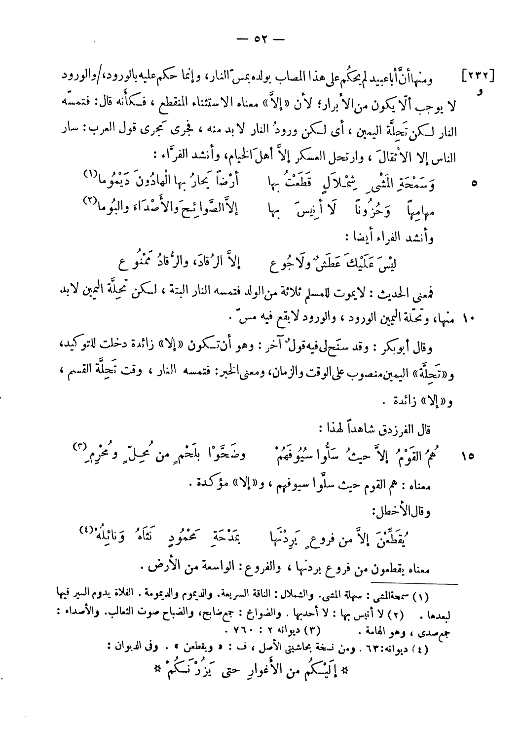 ومنها أنّ أبا عبيد لم يحكم على هذا المصاب بولده بمسّ النار، وإنما حكم عليه بالورود، / والورود لا يوجب ألّا يكون من الأبرار؛ لأن «إلّا» معناه الاستثناء المنقطع، فكأنه قال: فتمسّه النار لكن تحلّة اليمين، أى لكن ورود النار لا بدّ منه، فجرى مجرى قول العرب: سار الناس إلا الأثقال، وارتحل العسكر إلّا أهل الخيام، وأنشد الفرّاء: