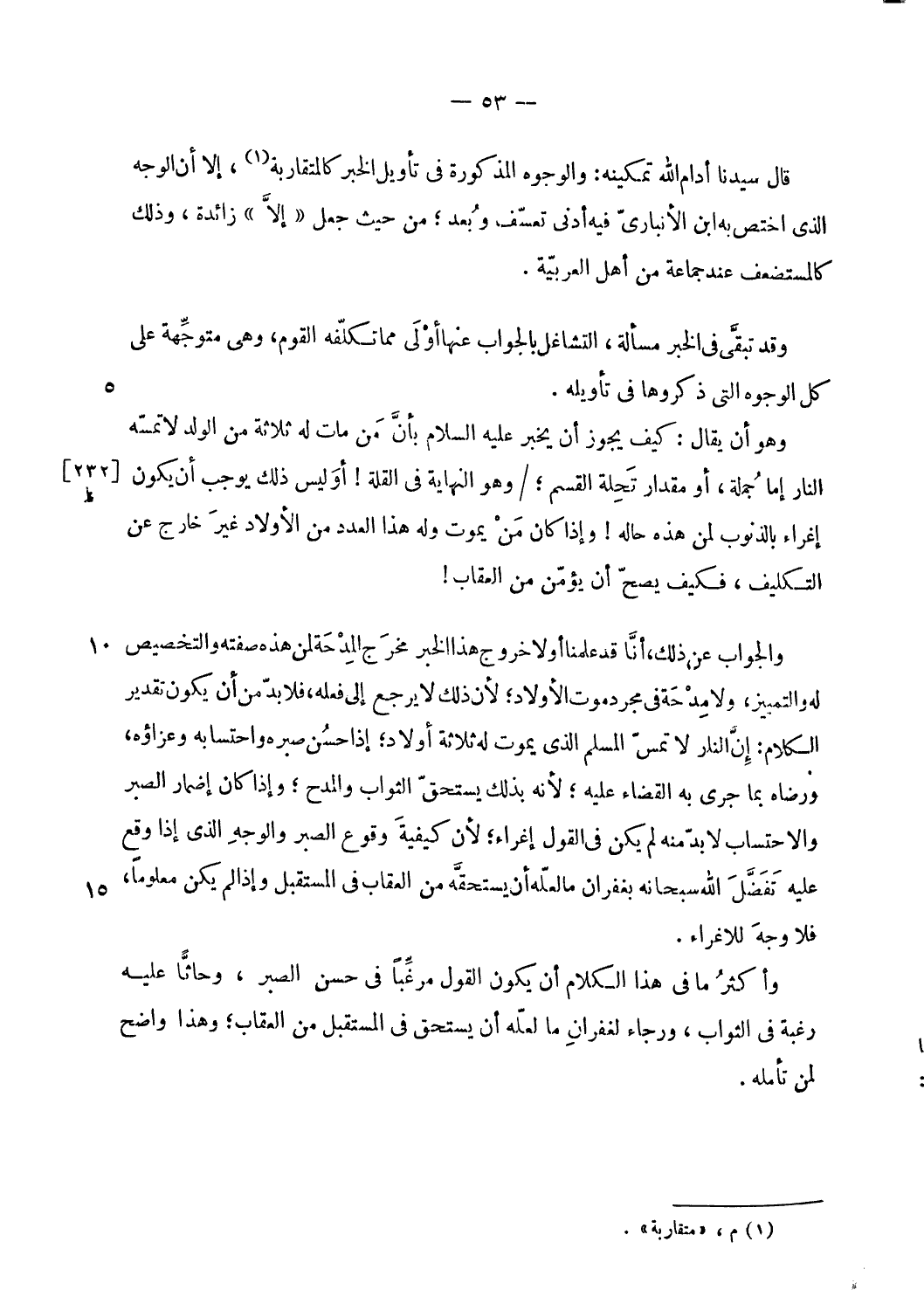 والجواب عن ذلك، أنّا قد علمنا أو لا خروج هذا الخبر مخرج المدحة لمن هذه صفته والتخصيص له والتمييز، ولا مدحة فى مجرد موت الأولاد؛ لأن ذلك لا يرجع إلى فعله، فلا بدّ من أن يكون تقدير الكلام: إنّ النار لا تمسّ المسلم الّذي يموت له ثلاثة أولاد؛ إذا حسن صبره واحتسابه وعزاؤه، ورضاه بما جرى به القضاء عليه؛ لأنه بذلك يستحقّ الثواب والمدح؛ وإذا كان إضمار الصبر والاحتساب لا بدّ منه لم يكن فى القول إغراء؛ لأن كيفية وقوع الصبر والوجه الّذي إذا وقع عليه تفضّل الله سبحانه بغفران ما لعلّه أن يستحقّه من العقاب فى المستقبل وإذا لم يكن معلوما، فلا وجه للاغراء.