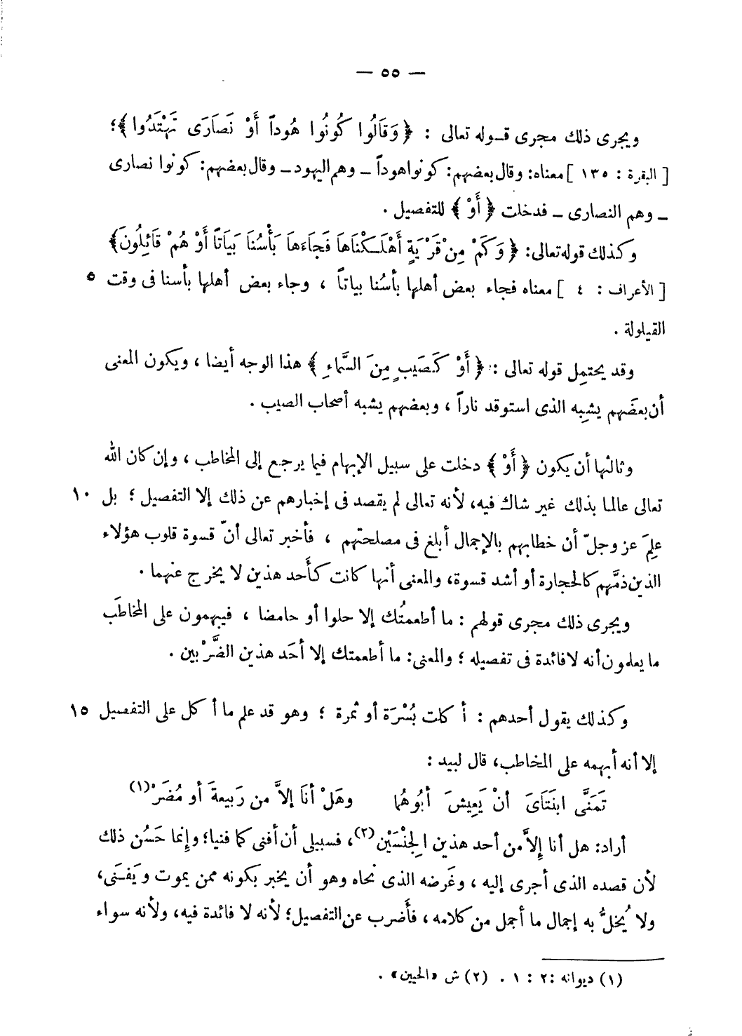 ويجرى ذلك مجرى قوله تعالى: وَقالُوا كُونُوا هُوداً أَوْ نَصارى تَهْتَدُوا؛ [البقرة: 135] معناه: وقال بعضهم: كونوا هودا- وهم اليهود- وقال بعضهم: كونوا نصارى وهم النصارى- فدخلت أَوْ للتفصيل.