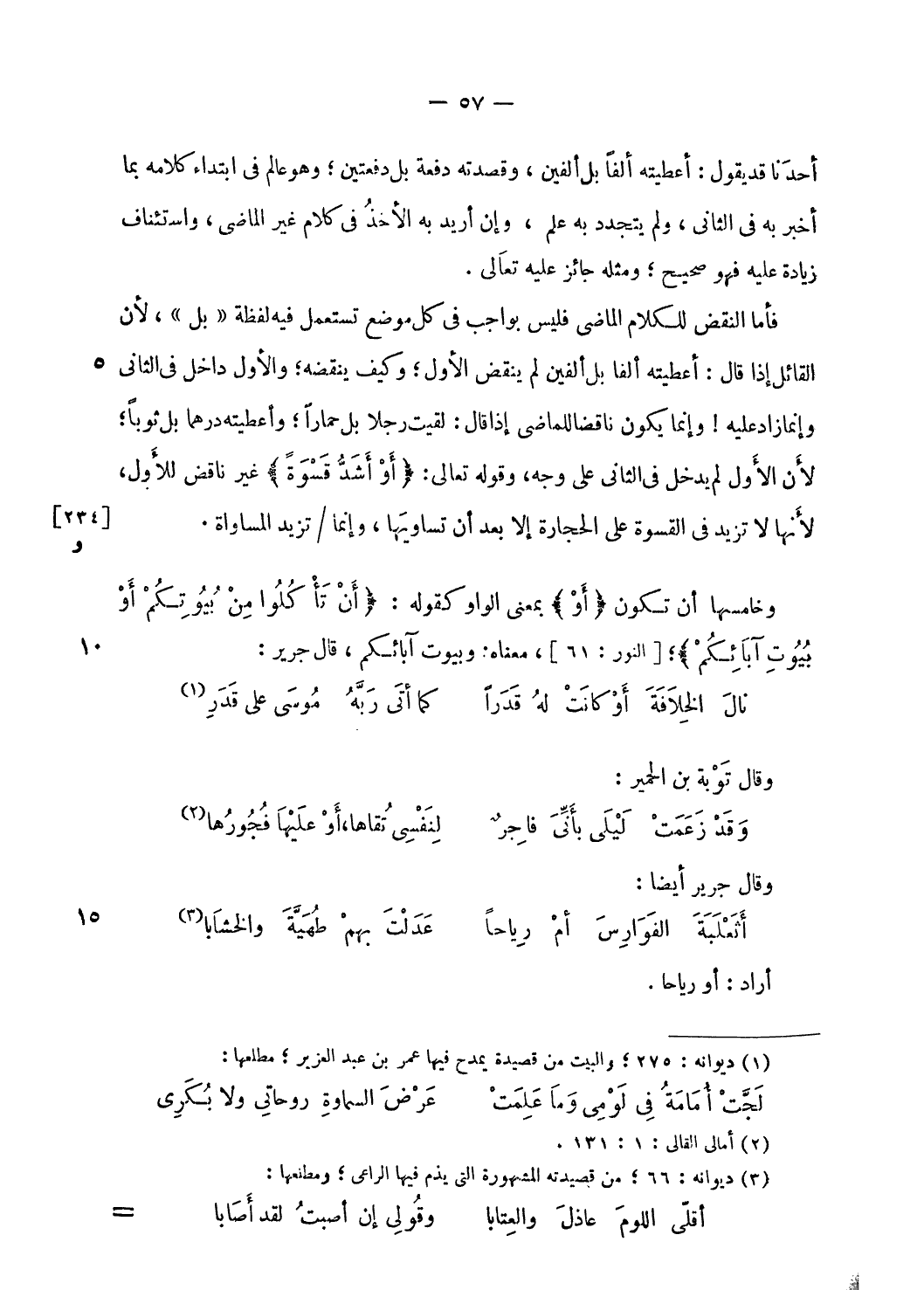 فأما النقض للكلام الماضى فليس بواجب فى كل موضع تستعمل فيه لفظة «بل»، لأن القائل إذا قال: أعطيته ألفا بل ألفين لم ينقض الأول؛ وكيف ينقضه؛ والأول داخل فى الثانى وإنما زاد عليه! وإنما يكون ناقضا للماضى إذا قال: لقيت رجلا بل حمارا؛ وأعطيته درهما بل ثوبا؛ لأن الأول لم يدخل فى الثانى على وجه، وقوله تعالى: أَوْ أَشَدُّ قَسْوَةً غير ناقض للأول، لأنها لا تزيد فى القسوة على الحجارة إلا بعد أن تساويها، وإنما/ تزيد المساواة.