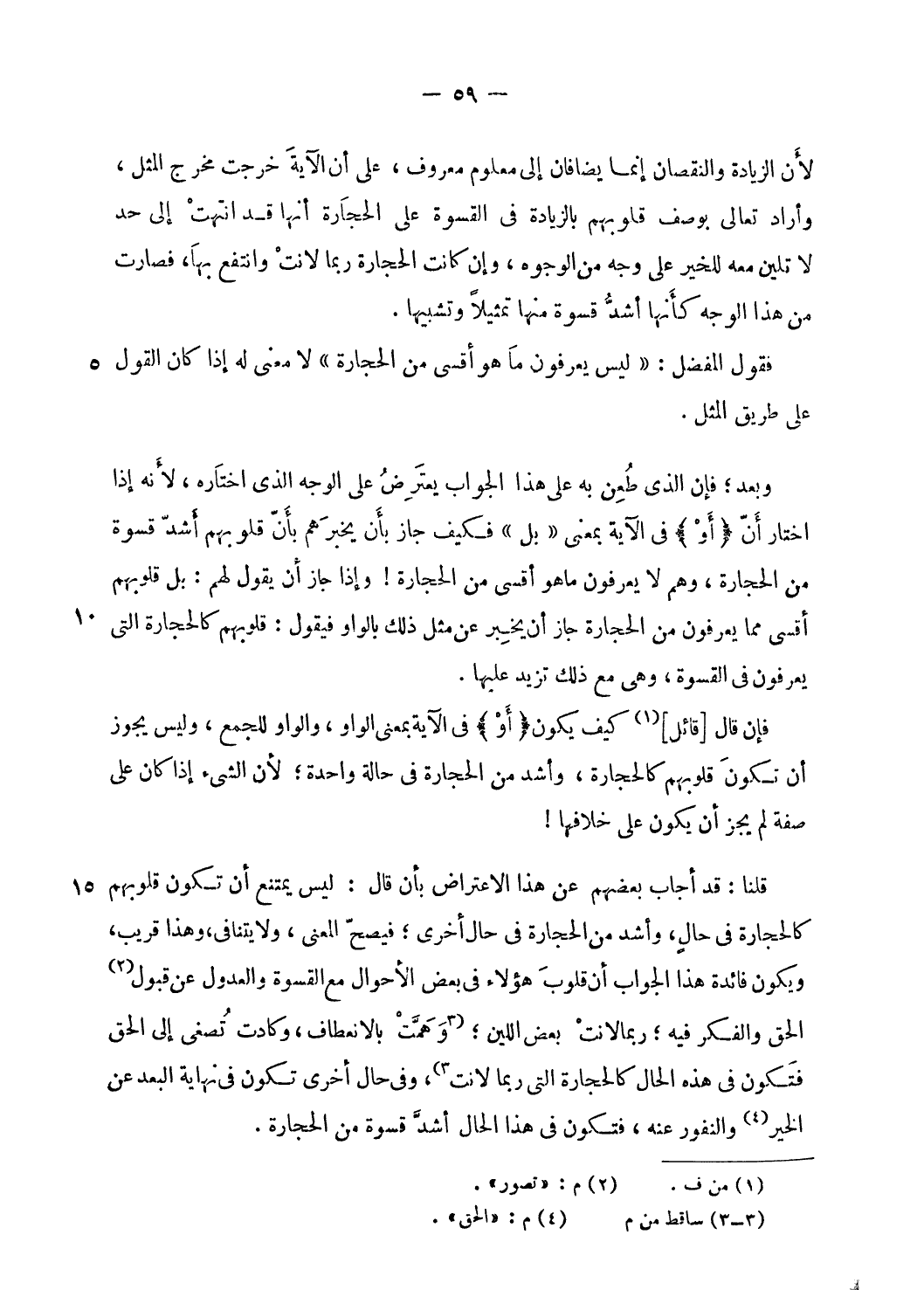 قلنا: قد أجاب بعضهم عن هذا الاعتراض بأن قال: ليس يمتنع أن تكون قلوبهم كالحجارة فى حال، وأشد من الحجارة فى حال أخرى؛ فيصحّ المعنى، ولا يتنافى، وهذا قريب، ويكون فائدة هذا الجواب أن قلوب هؤلاء فى بعض الأحوال مع القسوة والعدول عن قبول (¬2) الحق والفكر فيه؛ ربما لانت بعض اللين؛ [وهمّت بالانعطاف، وكادت تصغى إلى الحق فتكون فى هذه الحال كالحجارة التى ربما لانت] (¬3)، وفى حال أخرى تكون فى نهاية البعد عن الخير (¬4) والنفور عنه، فتكون فى هذا الحال أشدّ قسوة من الحجارة.