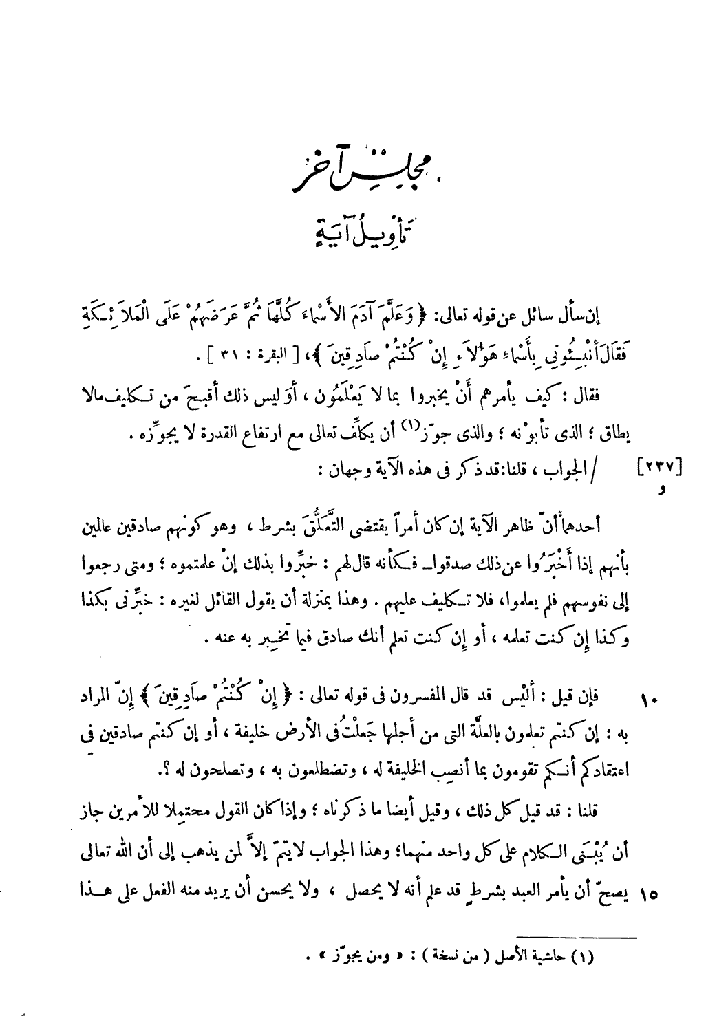 فإن قيل: أليس قد قال المفسرون فى قوله تعالى: إِنْ كُنْتُمْ صادِقِينَ إنّ المراد به: إن كنتم تعلمون بالعلّة التى من أجلها جعلت فى الأرض خليفة، أو إن كنتم صادقين فى اعتقادكم أنكم تقومون بما أنصب الخليفة له، وتضطلعون به، وتصلحون له؟ .