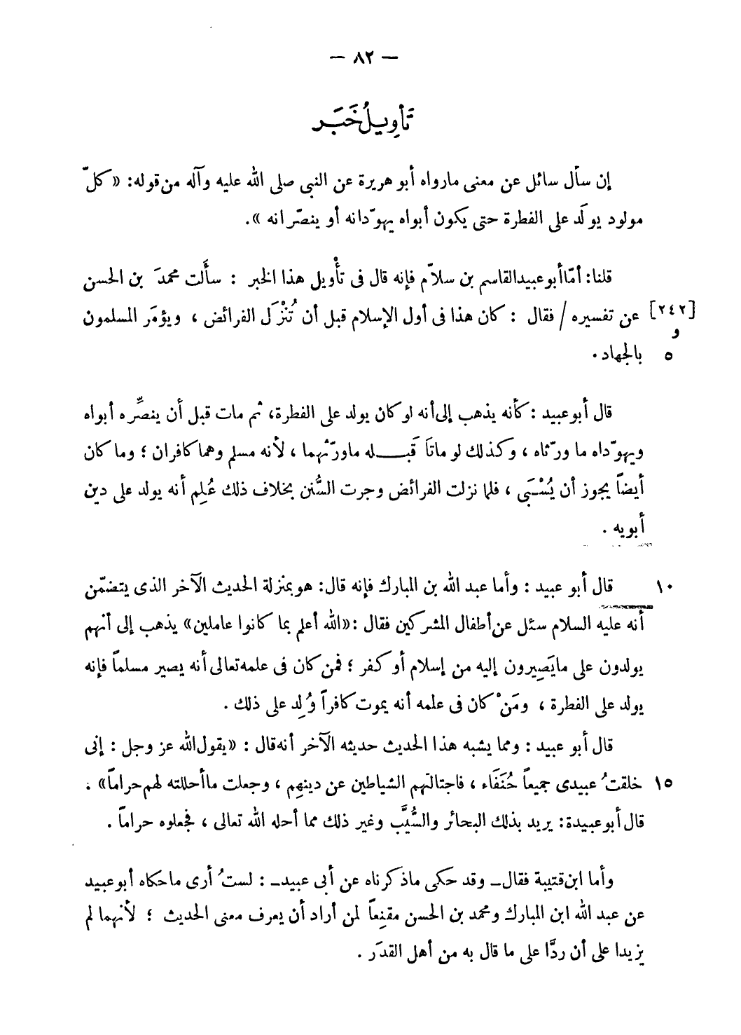 وأما ابن قتيبة فقال- وقد حكى ما ذكرناه عن أبى عبيد-: لست أرى ما حكاه أبو عبيد عن عبد الله ابن المبارك ومحمد بن الحسن مقنعا لمن أراد أن يعرف معنى الحديث؛ لأنهما لم يزيدا على أن ردّا على ما قال به من أهل القدر.