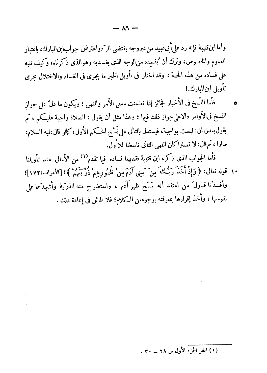 وأما ابن قتيبة فإنه رد على أبى عبيد من غير وجه يقتضي الرّد واعترض جواب ابن المبارك، باعتبار العموم والخصوص، وترك أن يفسده من الوجه الّذي يفسد به وهو الّذي ذكرناه، وكيف ننبه على فساده من هذه الجهة، وقد اختار فى تأويل الخبر ما يجرى فى الفساد والاختلال مجرى تأويل ابن المبارك.!