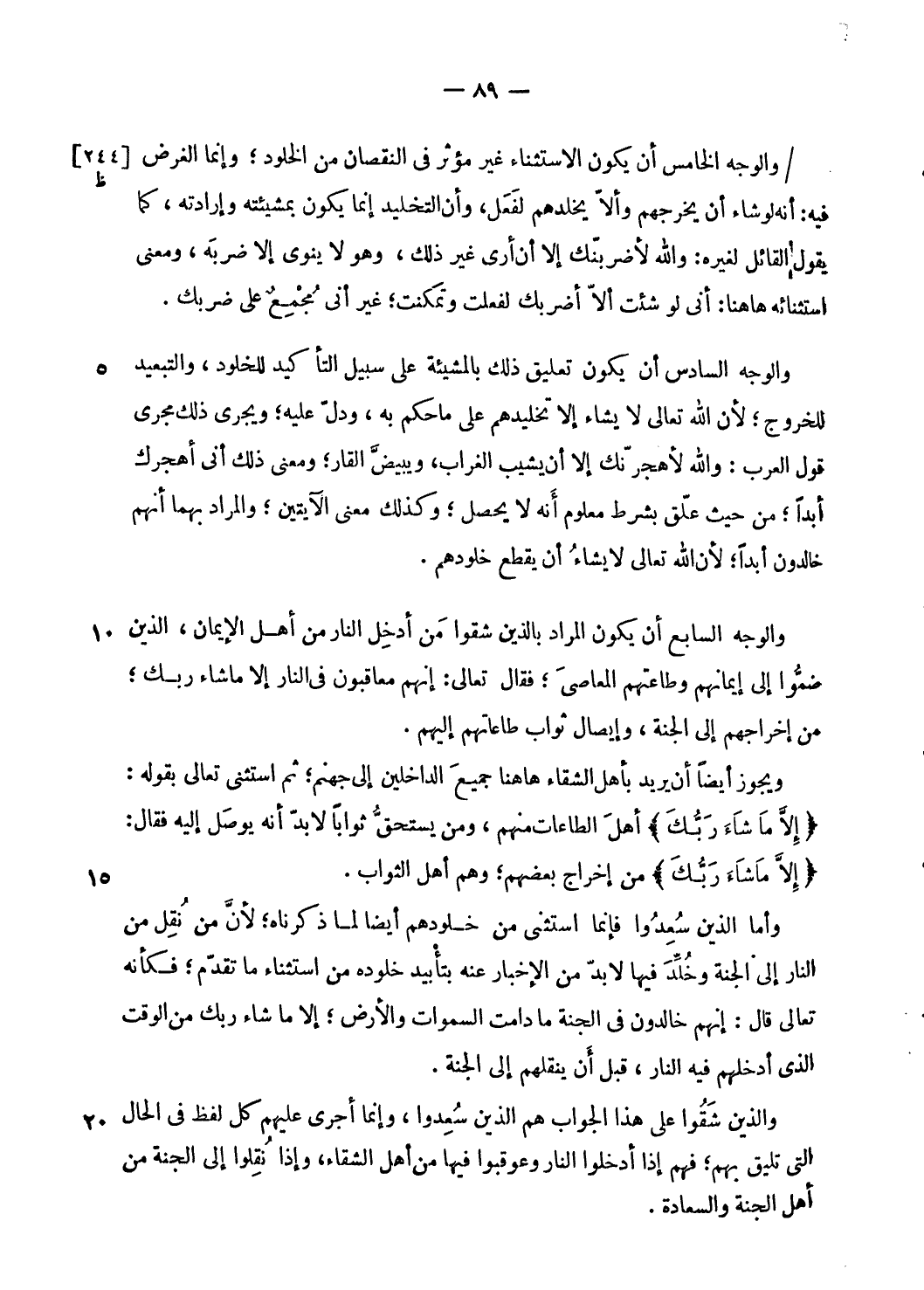 / والوجه الخامس أن يكون الاستثناء غير مؤثر فى النقصان من الخلود؛ وإنما الغرض فيه: أنه لو شاء أن يخرجهم وألّا يخلدهم لفعل، وأن التخليد إنما يكون بمشيئته وإرادته، كما يقول القائل لغيره: والله لأضربنّك إلا أن أرى غير ذلك، وهو لا ينوى إلا ضربه، ومعنى استثنائه هاهنا: أنى لو شئت ألّا أضربك لفعلت وتمكنت؛ غير أنى مجمع على ضربك.