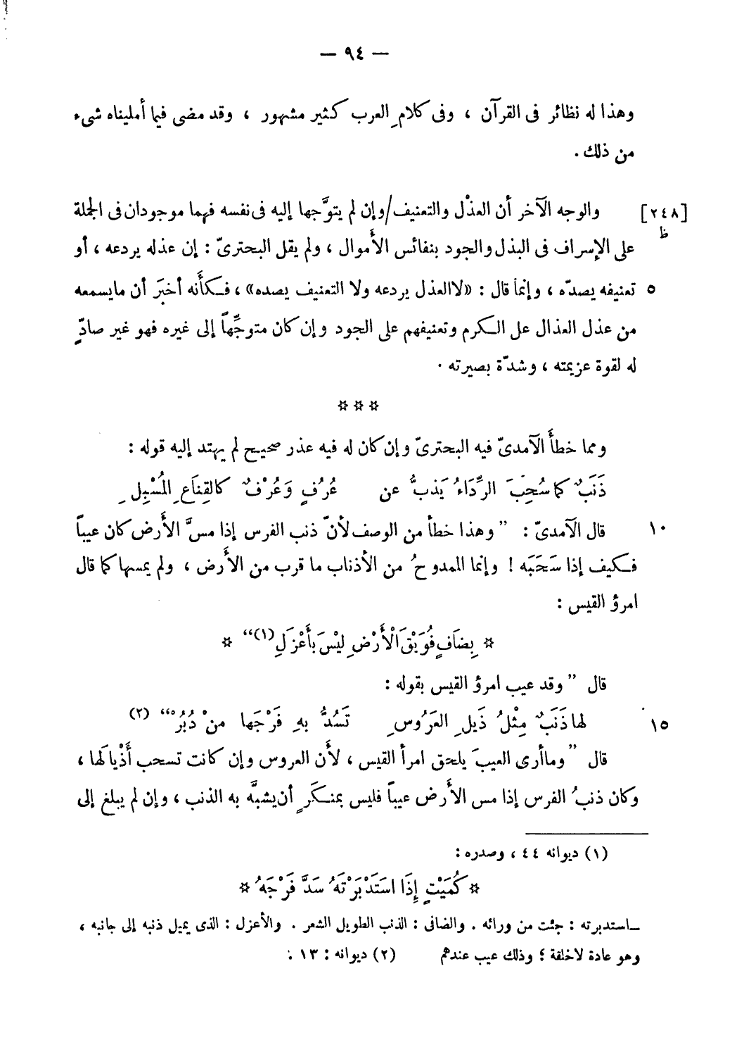 قال الآمدىّ: " وهذا خطأ من الوصف لأنّ ذنب الفرس إذا مسّ الأرض كان عيبا فكيف إذا سحبه! وإنما الممدوح من الأذناب ما قرب من الأرض، ولم يمسها كما قال امرؤ القيس: