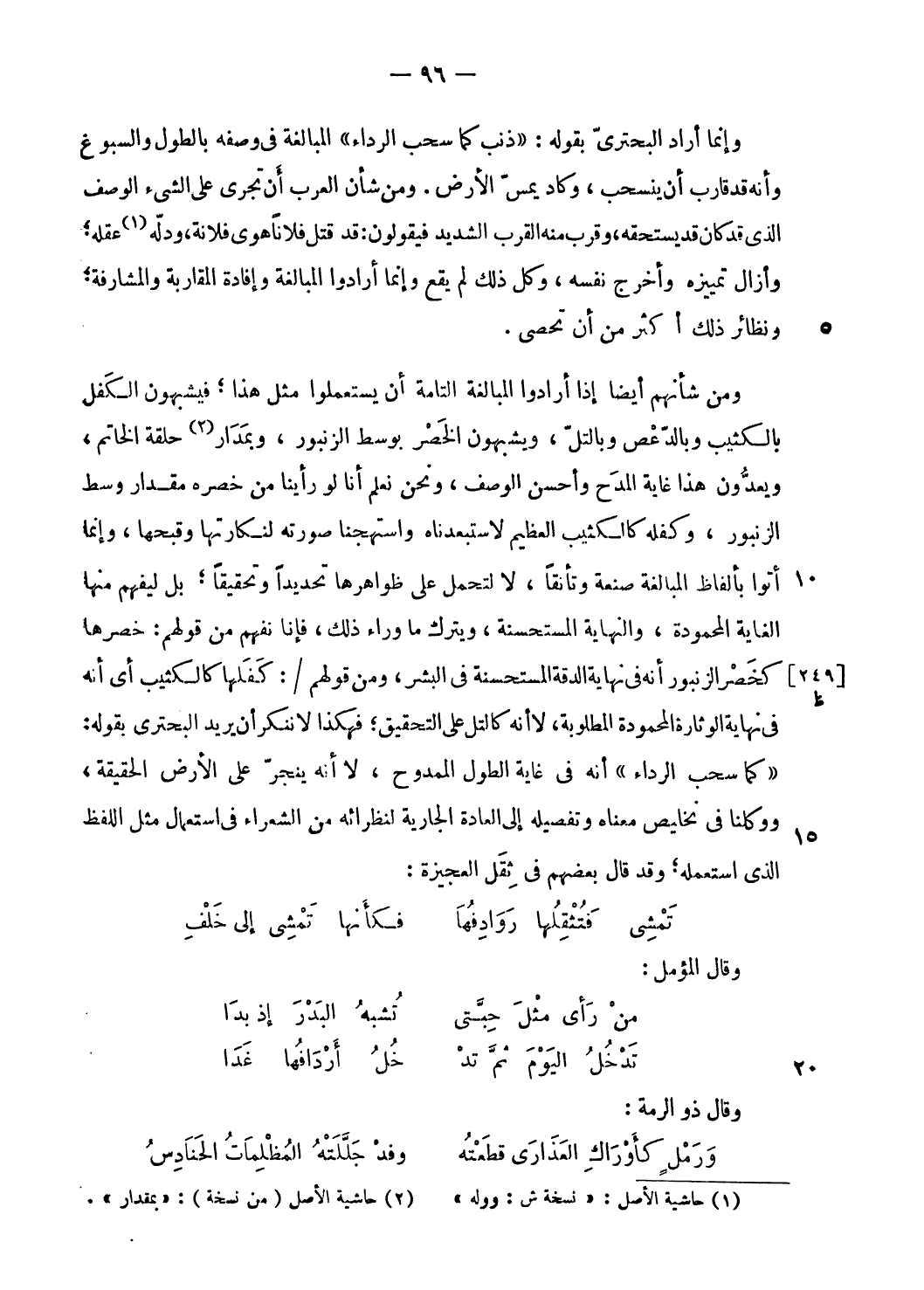 «كما سحب الرداء» أنه فى غاية الطول الممدوح، لا أنه ينجرّ على الأرض الحقيقة، ووكلنا فى تخليص معناه وتفصيله إلى العادة الجارية لنظرائه من الشعراء فى استعمال مثل اللفظ الّذي استعمله؛ وقد قال بعضهم فى ثقل العجيزة: