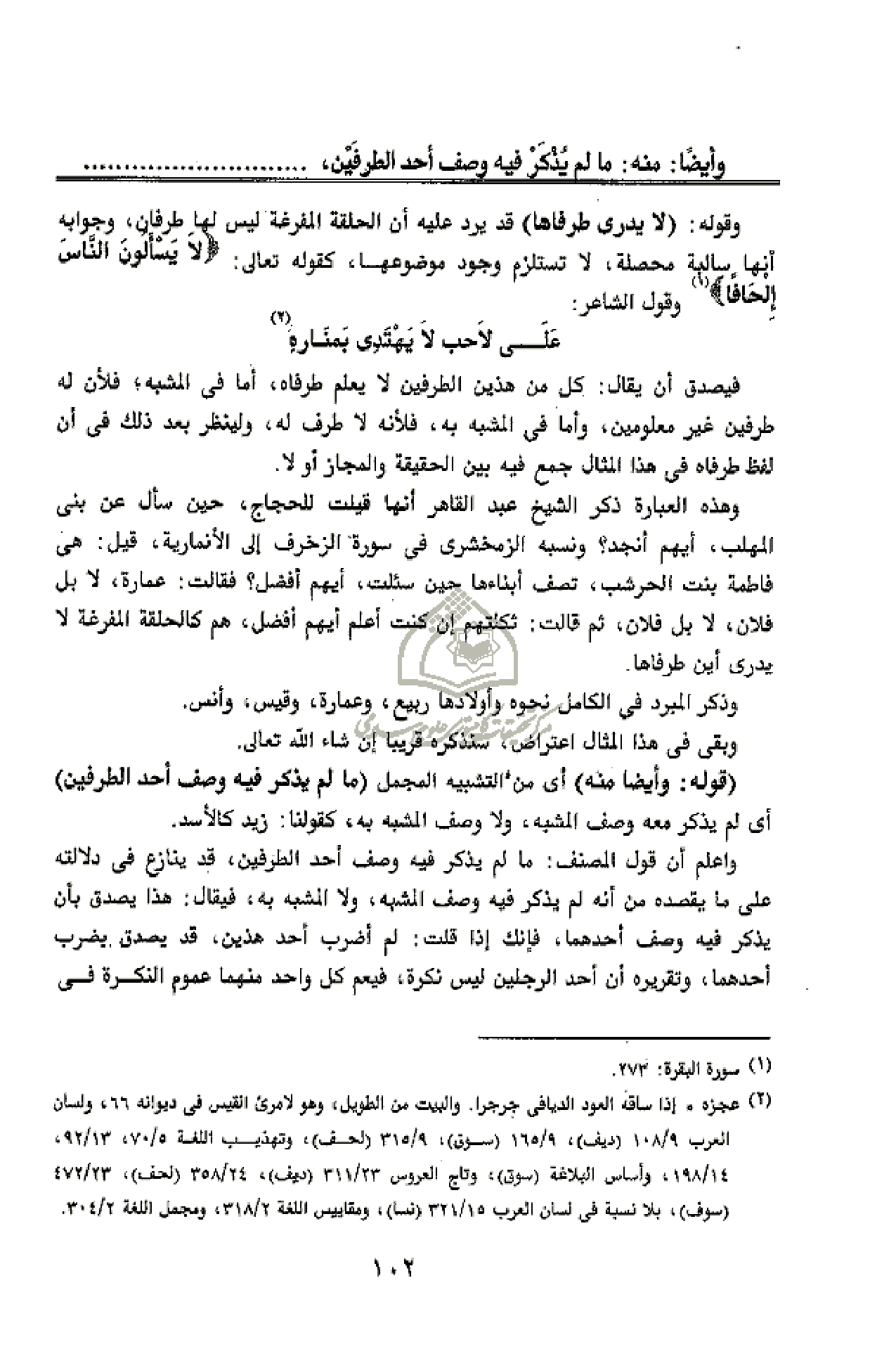 فيصدق أن يقال: كل من هذين الطرفين لا يعلم طرفاه، أما فى المشبه؛ فلأن له طرفين غير معلومين، وأما فى المشبه به، فلأنه لا طرف له، ولينظر بعد ذلك فى أن لفظ طرفاه فى هذا المثال جمع فيه بين الحقيقة والمجاز أو لا.