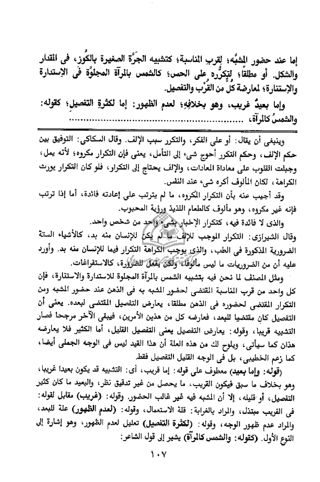 ومثل المصنف لما نحن فيه بتشبيه الشمس بالمرآة المجلوة للاستدارة والاستنارة، فإن كل واحد من قرب المناسبة المقتضى لحضور المشبه به فى الذهن عند حضور المشبه ومن التكرار المقتضى لحضوره فى الذهن مطلقا، يعارض التفصيل المقتضى لبعده. يعنى أن التفصيل كان مقتضيا للبعد، فعارضه كل من هذين الأمرين، فيبقى الآخر مرجحا فصار التشبيه قريبا، وقوله: يعارض التفصيل يعنى التفصيل القليل، أما الكثير فلا يعارضه هذان كما سيأتى، ويلوح لك من هذه العلة أن هذا القيد ليس فى الوجه الجملى أيضا، كما زعم الخطيبى، بل فى الوجه القليل التفصيل فقط.