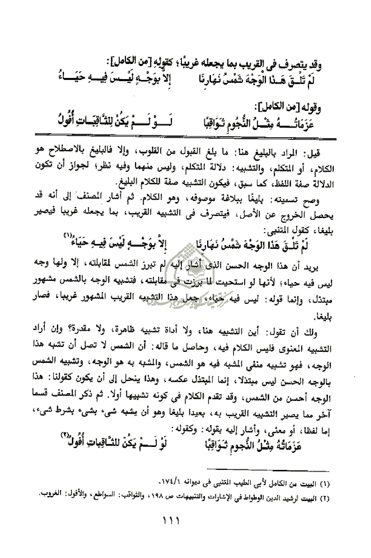 وصح تسميته: بليغا ببلاغة موصوفه، وهو الكلام. ثم أشار المصنف إلى أنه قد يحصل الخروج عن الأصل، فيتصرف فى التشبيه القريب، بما يجعله غريبا فيصير بليغا، كقول المتنبى: