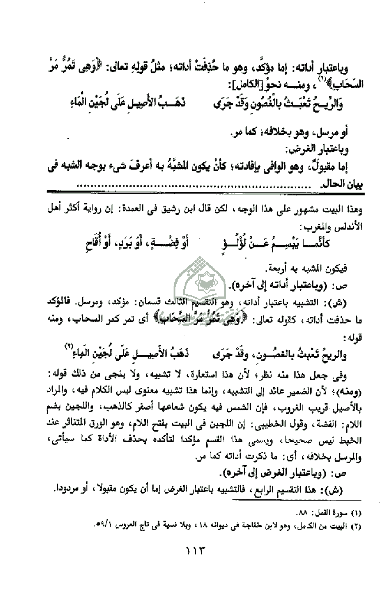 (ش): التشبيه باعتبار أداته، وهو التقسيم الثالث قسمان: مؤكد، ومرسل. فالمؤكد ما حذفت أداته، كقوله تعالى: وَهِيَ تَمُرُّ مَرَّ السَّحابِ أى تمر كمر السحاب، ومنه قوله: