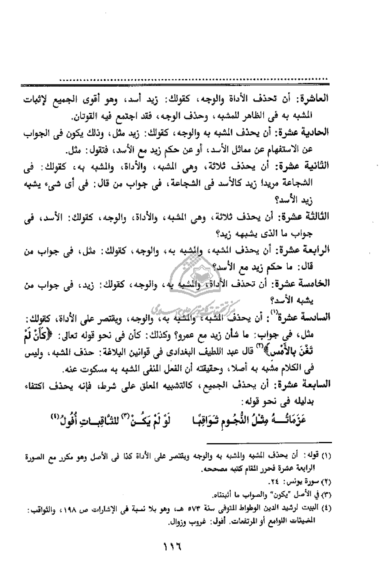 (¬1) قوله: أن يحذف المشبه والمشبه به والوجه ويقتصر على الأداة كذا فى الأصل وهو مكرر مع الصورة الرابعة عشرة فحرر المقام كتبه مصححه.