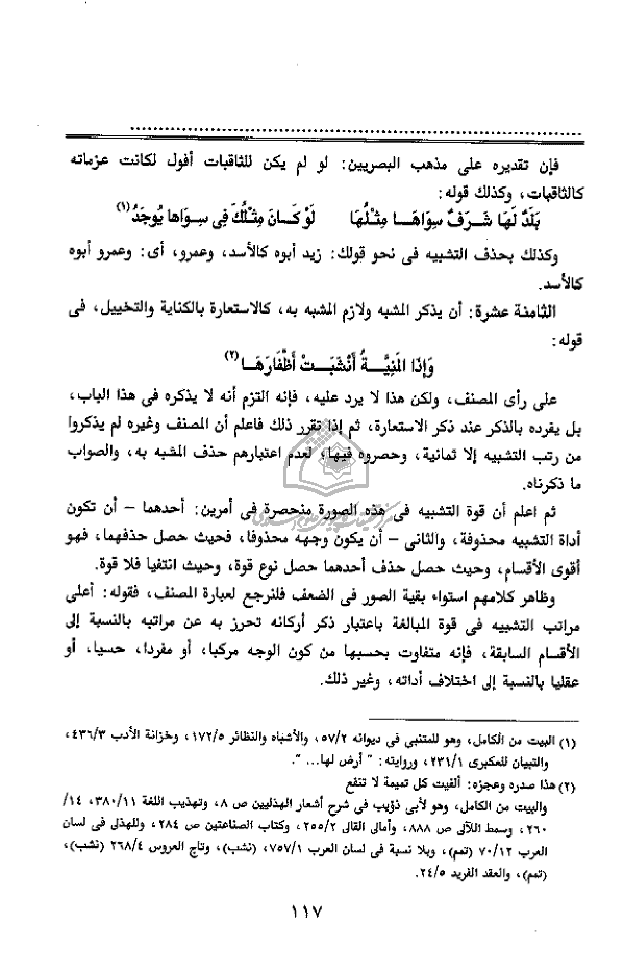 ثم اعلم أن قوة التشبيه فى هذه الصورة منحصرة فى أمرين: أحدهما - أن تكون أداة التشبيه محذوفة، والثانى - أن يكون وجهه محذوفا، فحيث حصل حذفهما، فهو أقوى الأقسام، وحيث حصل حذف أحدهما حصل نوع قوة، وحيث انتفيا فلا قوة.