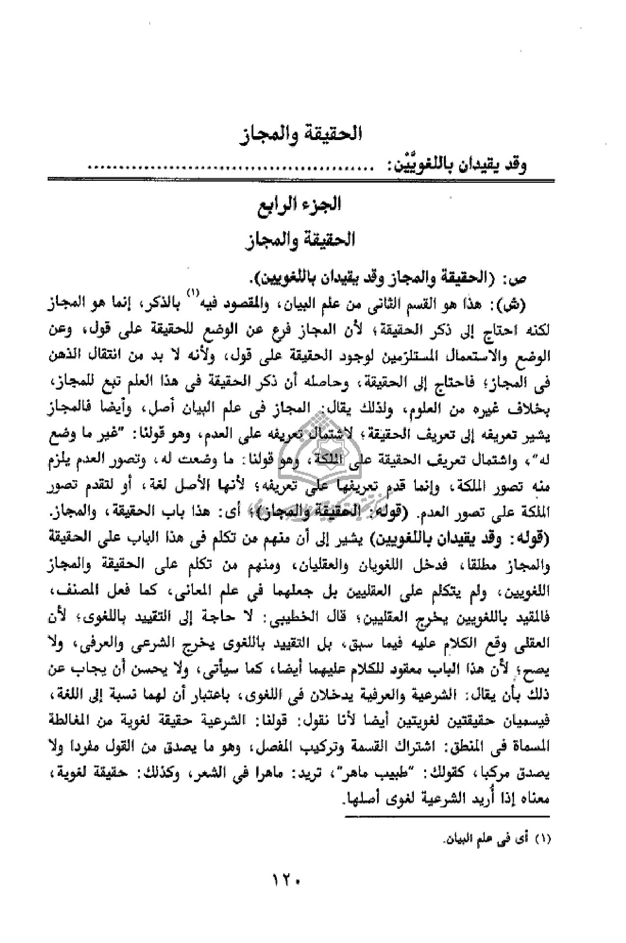 الجزء الرابع الحقيقة والمجاز ص: (الحقيقة والمجاز وقد يقيدان باللغويين).