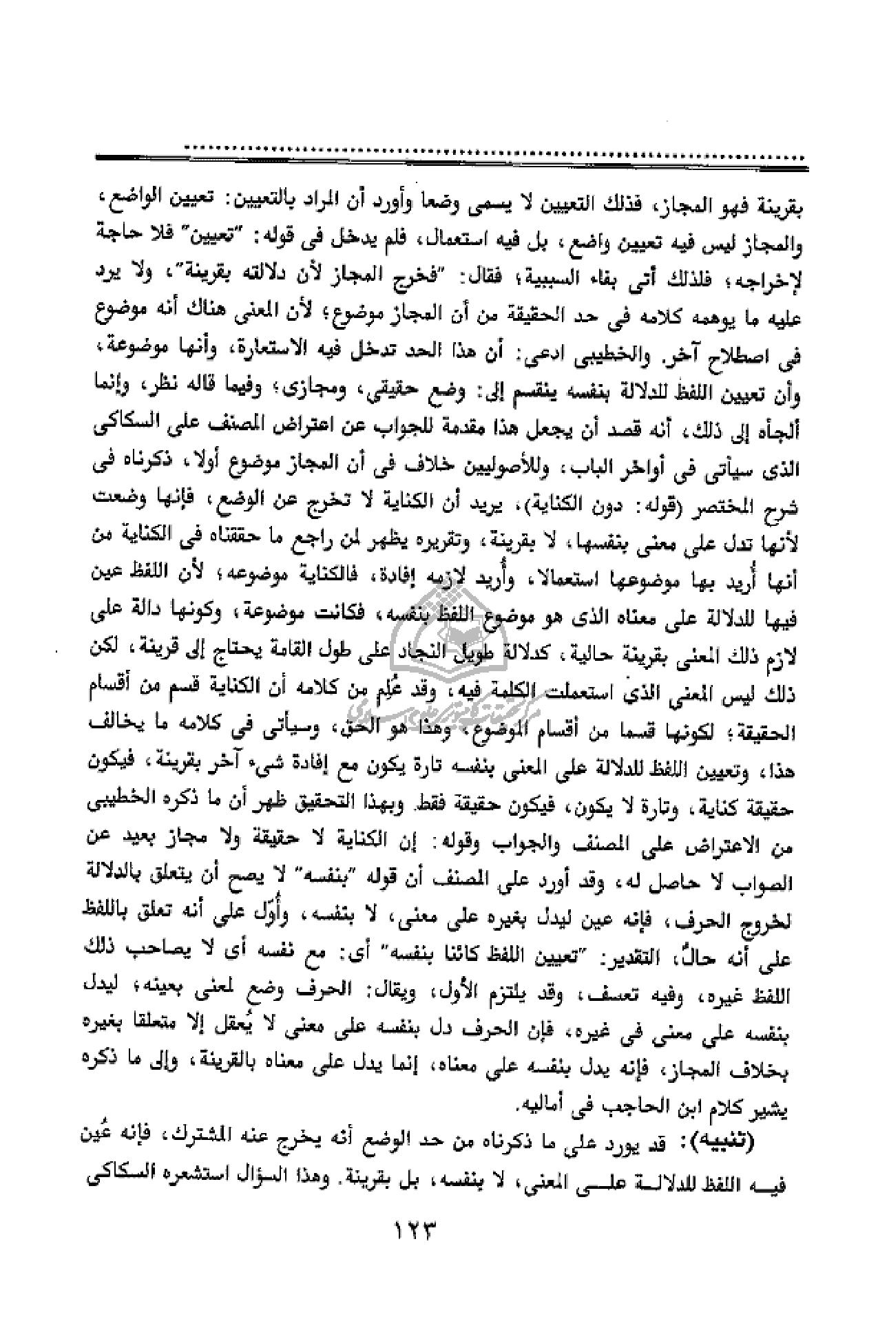 من أقسام الحقيقة؛ لكونها قسما من أقسام الموضوع، وهذا هو الحق، وسيأتى فى كلامه ما يخالف هذا، وتعيين اللفظ للدلالة على المعنى بنفسه تارة يكون مع إفادة شئ آخر بقرينة، فيكون حقيقة كناية، وتارة لا يكون، فيكون حقيقة فقط. وبهذا التحقيق ظهر أن ما ذكره الخطيبى من الاعتراض على المصنف والجواب وقوله: إن الكناية لا حقيقة ولا مجاز بعيد عن الصواب لا حاصل له، وقد أورد على المصنف أن قوله" بنفسه" لا يصح أن يتعلق بالدلالة لخروج الحرف، فإنه عين ليدل بغيره على معنى، لا بنفسه، وأوّل على أنه تعلق باللفظ على أنه حال، التقدير:" تعيين اللفظ كائنا بنفسه" أى: مع نفسه أى لا يصاحب ذلك اللفظ غيره، وفيه تعسف، وقد يلتزم الأول، ويقال: الحرف وضع لمعنى بعينه؛ ليدل بنفسه على معنى فى غيره، فإن الحرف دل بنفسه على معنى لا يعقل إلا متعلقا بغيره بخلاف المجاز، فإنه يدل بنفسه على معناه، إنما يدل على معناه بالقرينة، وإلى ما ذكره يشير كلام ابن الحاجب فى أماليه.