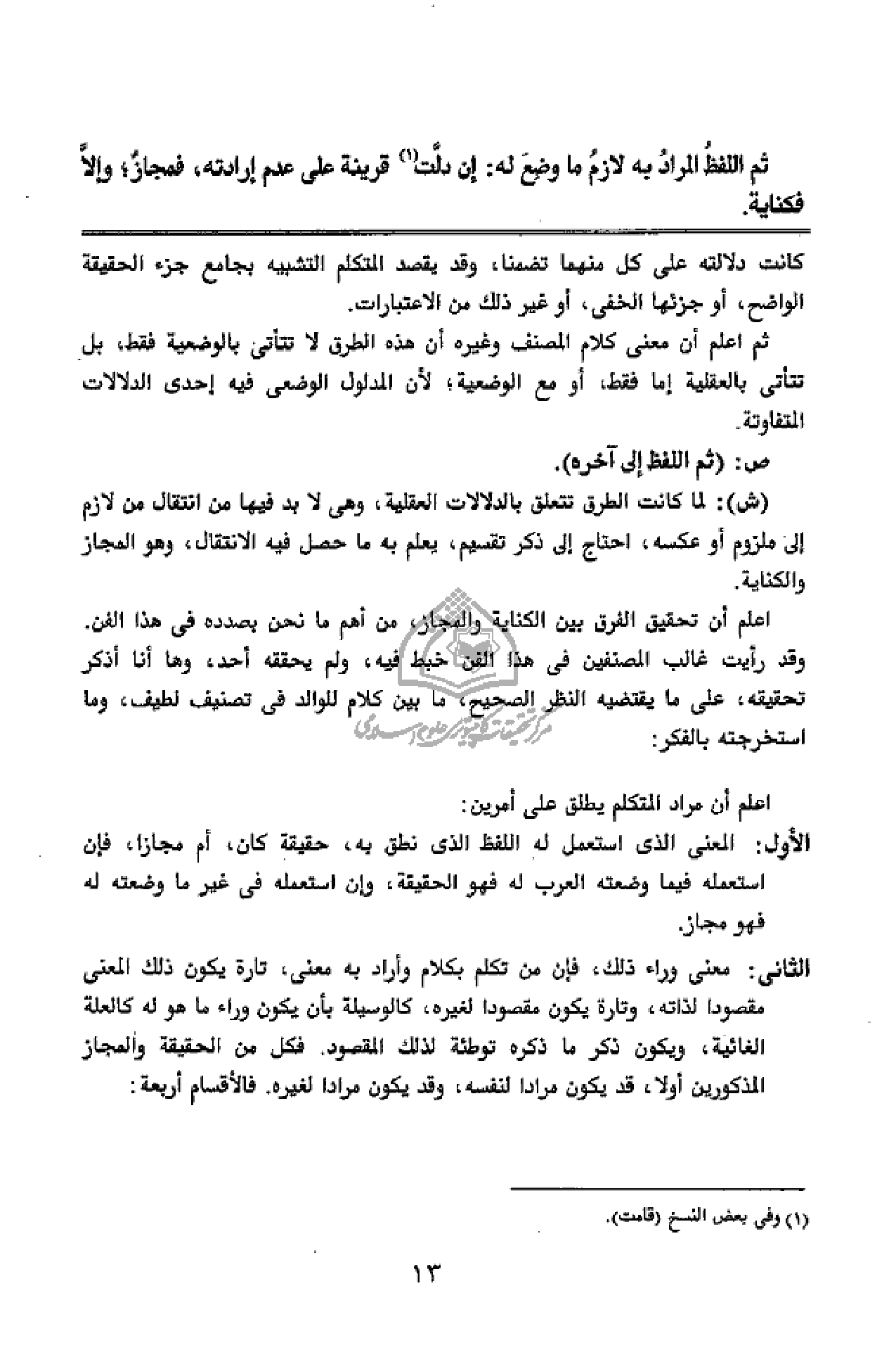 الثانى: معنى وراء ذلك، فإن من تكلم بكلام وأراد به معنى، تارة يكون ذلك المعنى مقصودا لذاته، وتارة يكون مقصودا لغيره، كالوسيلة بأن يكون وراء ما هو له كالعلة الغائية، ويكون ذكر ما ذكره توطئة لذلك المقصود. فكل من الحقيقة والمجاز المذكورين أولا، قد يكون مرادا لنفسه، وقد يكون مرادا لغيره. فالأقسام أربعة: