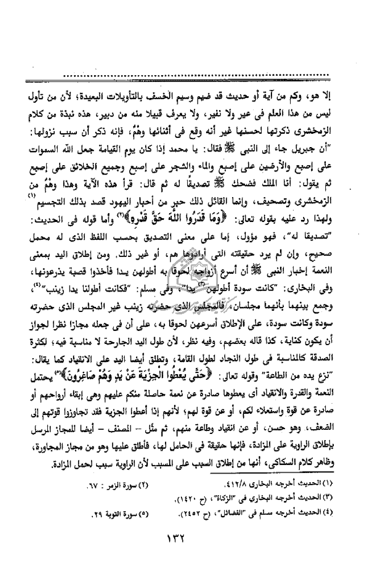 " تصديقا له"، فهو مؤول، إما على معنى التصديق بحسب اللفظ الذى له محمل صحيح، وإن لم يرد حقيقته التى أرادوها هم، أو غير ذلك. ومن إطلاق اليد بمعنى النعمة إخبار النبى صلّى الله عليه وسلّم أن أسرع أزواجه لحوقا به أطولهن يدا فأخذوا قصبة يذرعونها، وفى البخارى:" كانت سودة أطولهن (¬3) يدا"، وفى مسلم:" فكانت أطولنا يدا زينب" (¬4)، وجمع بينهما بأنهما مجلسان، فالمجلس الذى حضرته زينب غير المجلس الذى حضرته سودة وكانت سودة، على الإطلاق أسرعهن لحوقا به، على أن فى جعله مجازا نظرا لجواز أن يكون كناية، كذا قاله بعضهم، وفيه نظر؛ لأن طول اليد الجارحة لا مناسبة فيه؛ لكثرة الصدقة كالمناسبة فى طول النجاد لطول القامة، وتطلق أيضا اليد على الانقياد كما يقال: