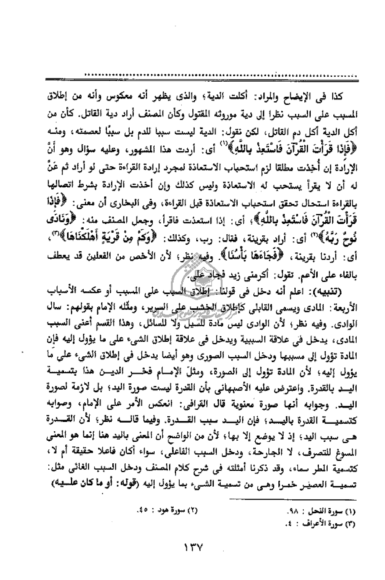 كذا فى الإيضاح والمراد: أكلت الدية؛ والذى يظهر أنه معكوس وأنه من إطلاق المسبب على السبب نظرا إلى دية موروثه المقتول وكأن المصنف أراد دية القاتل. كأن من أكل الدية أكل دم القاتل، لكن نقول: الدية ليست سببا للدم بل سببا لعصمته، ومنه فَإِذا قَرَأْتَ الْقُرْآنَ فَاسْتَعِذْ بِاللَّهِ (¬1) أى: أردت هذا المشهور، وعليه سؤال وهو أنّ الإرادة إن أخذت مطلقا لزم استحباب الاستعاذة لمجرد إرادة القراءة حتى لو أراد ثم عنّ له أن لا يقرأ يستحب له الاستعاذة وليس كذلك وإن أخذت الإرادة بشرط اتصالها بالقراءة استحال تحقق استحباب الاستعاذة قبل القراءة، وفى البخارى أن معنى: فَإِذا قَرَأْتَ الْقُرْآنَ فَاسْتَعِذْ بِاللَّهِ؛ أى: إذا استعذت فاقرأ، وجعل المصنف منه: وَنادى نُوحٌ رَبَّهُ (¬2) أى: أراد بقرينة، فقال: رب، وكذلك: وَكَمْ مِنْ قَرْيَةٍ أَهْلَكْناها (¬3)، أى: أردنا بقرينة، فَجاءَها بَأْسُنا. وفيه نظر؛ لأن الأخص من الفعلين قد يعطف بالفاء على الأعم. تقول: أكرمنى زيد فجاد على.