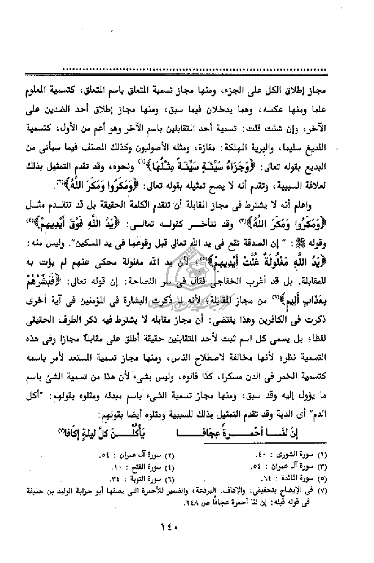 واعلم أنه لا يشترط فى مجاز المقابلة أن تتقدم الكلمة الحقيقة بل قد تتقدم مثل وَمَكَرُوا وَمَكَرَ اللَّهُ (¬3) وقد تتأخر كقوله تعالى: يَدُ اللَّهِ فَوْقَ أَيْدِيهِمْ (¬4) وقوله صلّى الله عليه وسلّم:" إن الصدقة تقع فى يد الله تعالى قبل وقوعها فى يد المسكين". وليس منه: