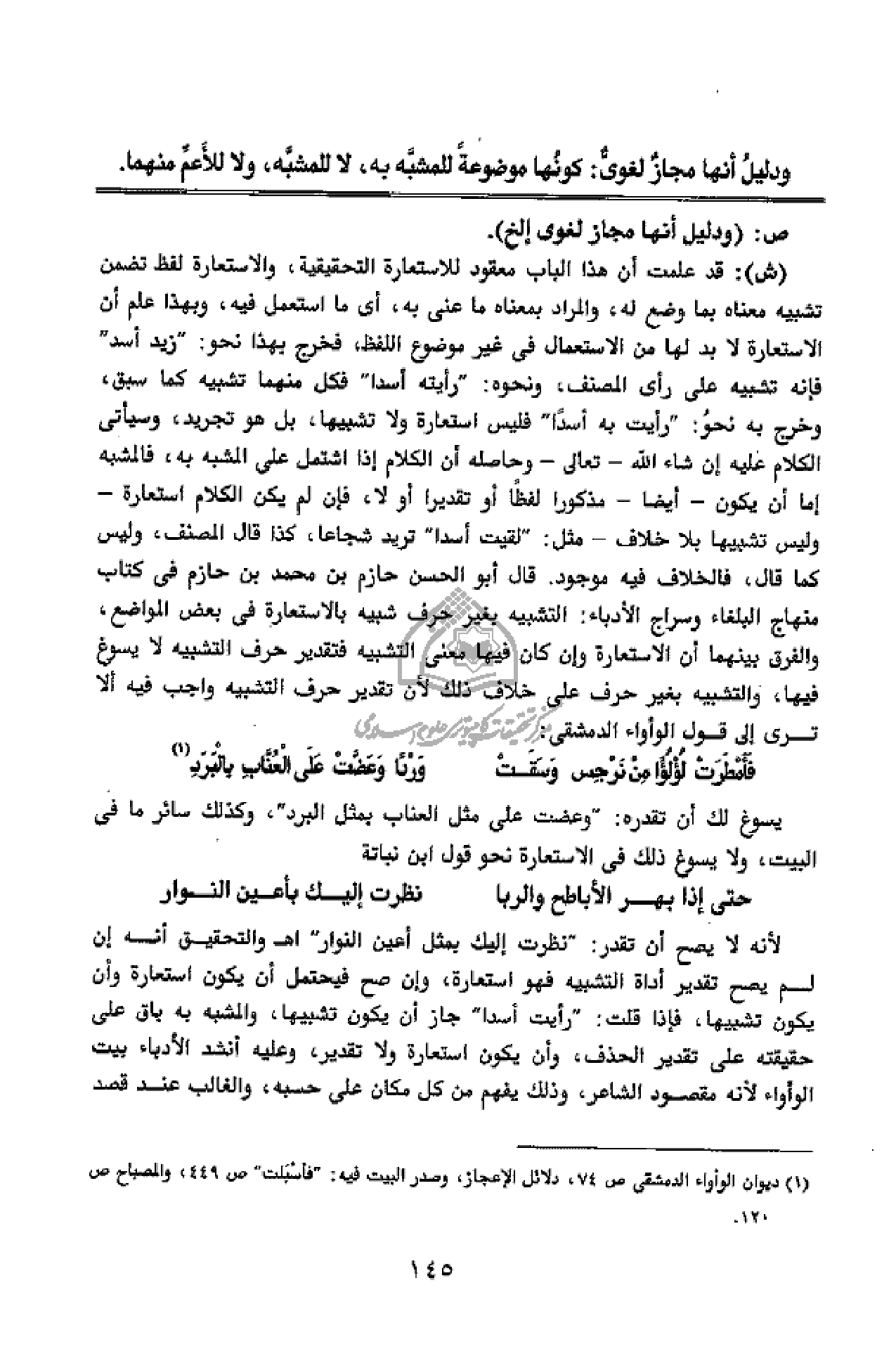 ودليل أنها مجاز لغوىّ: كونها موضوعة للمشبّه به، لا للمشبّه، ولا للأعمّ منهما.