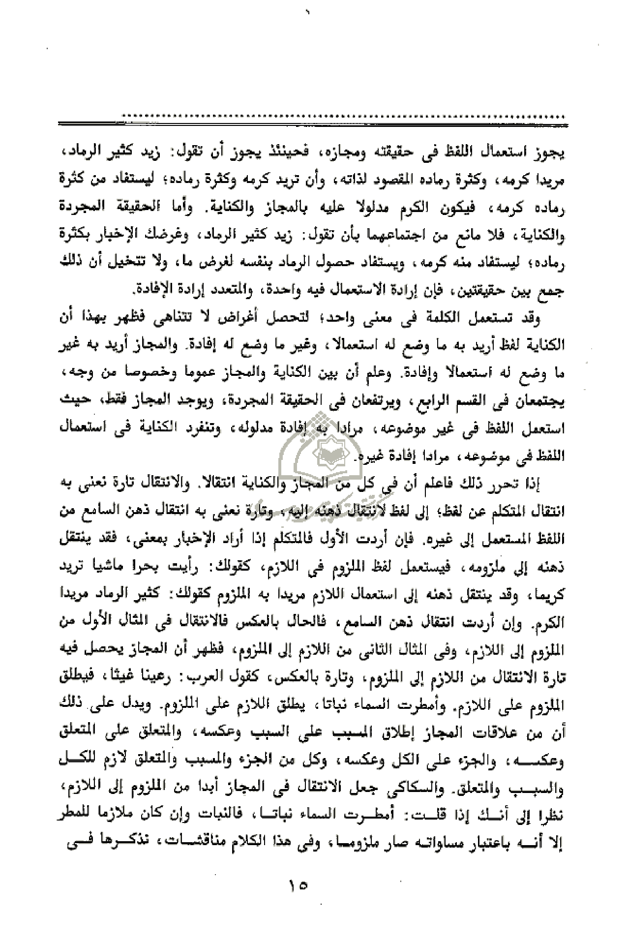 إذا تحرر ذلك فاعلم أن فى كل من المجاز والكناية انتقالا. والانتقال تارة نعنى به انتقال المتكلم عن لفظ؛ إلى لفظ لانتقال ذهنه إليه، وتارة نعنى به انتقال ذهن السامع من اللفظ المستعمل إلى غيره. فإن أردت الأول فالمتكلم إذا أراد الإخبار بمعنى، فقد ينتقل ذهنه إلى ملزومه، فيستعمل لفظ الملزوم فى اللازم، كقولك: رأيت بحرا ماشيا تريد كريما، وقد ينتقل ذهنه إلى استعمال اللازم مريدا به الملزوم كقولك: كثير الرماد مريدا الكرم. وإن أردت انتقال ذهن السامع، فالحال بالعكس فالانتقال فى المثال الأول من الملزوم إلى اللازم، وفى المثال الثانى من اللازم إلى الملزوم، فظهر أن المجاز يحصل فيه تارة الانتقال من اللازم إلى الملزوم، وتارة بالعكس، كقول العرب: رعينا غيثا، فيطلق الملزوم على اللازم. وأمطرت السماء نباتا، يطلق اللازم على الملزوم. ويدل على ذلك أن من علاقات المجاز إطلاق المسبب على السبب وعكسه، والمتعلق على المتعلق وعكسه، والجزء على الكل وعكسه، وكل من الجزء والمسبب والمتعلق لازم للكل والسبب والمتعلق. والسكاكى جعل الانتقال فى المجاز أبدا من الملزوم إلى اللازم، نظرا إلى أنك إذا قلت: أمطرت السماء نباتا، فالنبات وإن كان ملازما للمطر إلا أنه باعتبار مساواته صار ملزوما، وفى هذا الكلام مناقشات، نذكرها فى