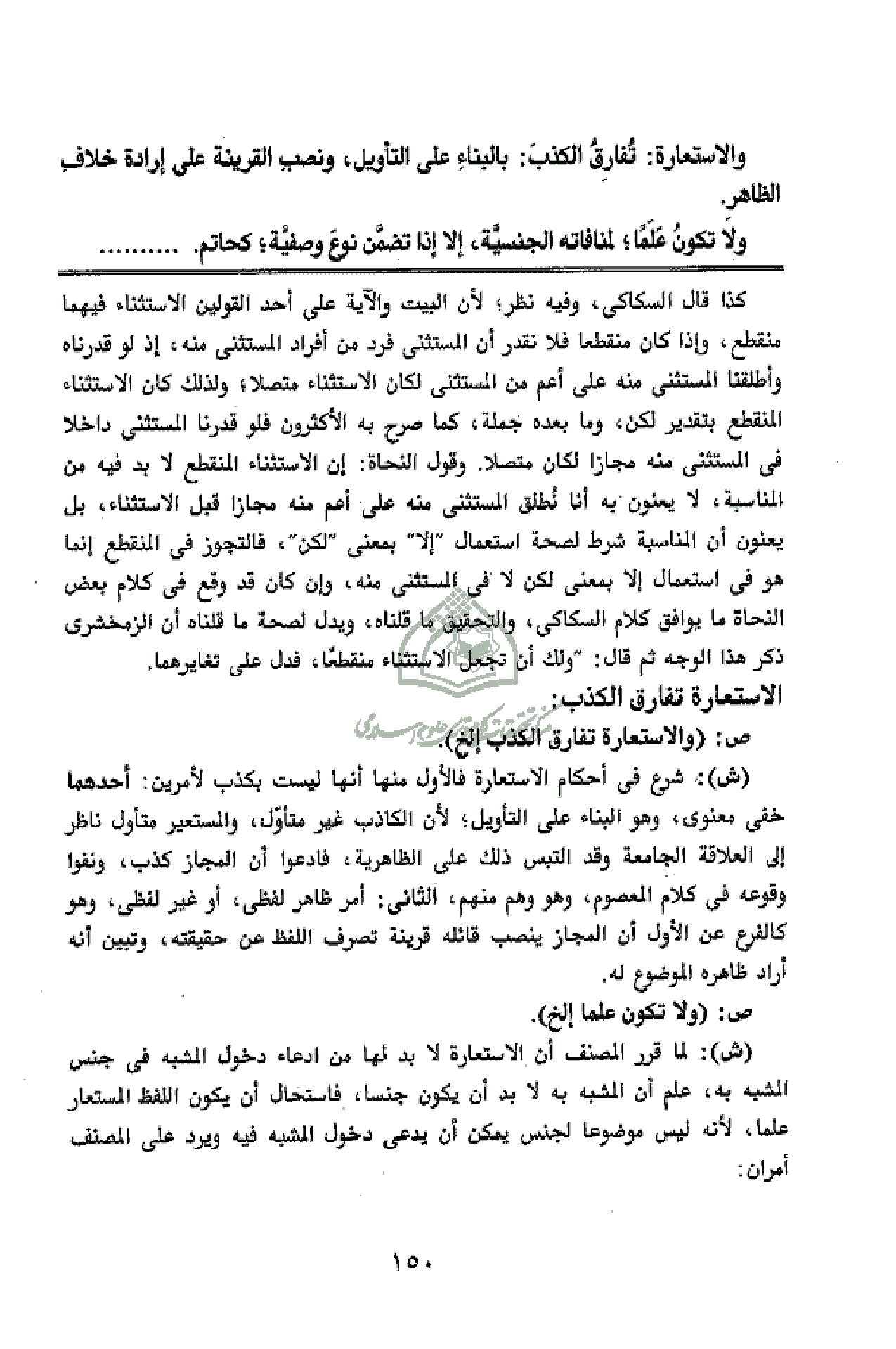 (ش): شرع فى أحكام الاستعارة فالأول منها أنها ليست بكذب لأمرين: أحدهما خفى معنوى، وهو البناء على التأويل؛ لأن الكاذب غير متأوّل، والمستعير متأول ناظر إلى العلاقة الجامعة وقد التبس ذلك على الظاهرية، فادعوا أن المجاز كذب، ونفوا وقوعه فى كلام المعصوم، وهو وهم منهم، الثانى: أمر ظاهر لفظى، أو غير لفظى، وهو كالفرع عن الأول أن المجاز ينصب قائله قرينة تصرف اللفظ عن حقيقته، وتبين أنه أراد ظاهره الموضوع له.