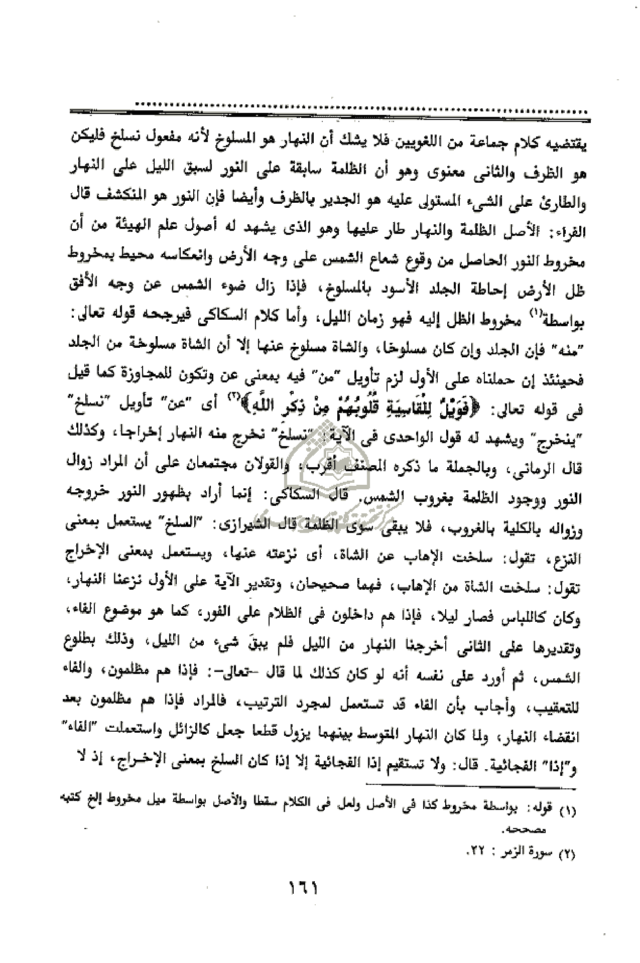 " منه" فإن الجلد وإن كان مسلوخا، والشاة مسلوخ عنها إلا أن الشاة مسلوخة من الجلد فحينئذ إن حملناه على الأول لزم تأويل" من" فيه بمعنى عن وتكون للمجاوزة كما قيل فى قوله تعالى: فَوَيْلٌ لِلْقاسِيَةِ قُلُوبُهُمْ مِنْ ذِكْرِ اللَّهِ (¬2) أى" عن" تأويل" نسلخ"" ينخرج" ويشهد له قول الواحدى فى الآية:" نسلخ" نخرج منه النهار إخراجا، وكذلك قال الرمانى، وبالجملة ما ذكره المصنف أقرب، والقولان مجتمعان على أن المراد زوال النور ووجود الظلمة بغروب الشمس. قال السكاكى: إنما أراد بظهور النور خروجه وزواله بالكلية بالغروب، فلا يبقى سوى الظلمة قال الشيرازى:" السلخ" يستعمل بمعنى النزع، تقول: سلخت الإهاب عن الشاة، أى نزعته عنها، ويستعمل بمعنى الإخراج تقول: سلخت الشاة من الإهاب، فهما صحيحان، وتقدير الآية على الأول نزعنا النهار، وكان كاللباس فصار ليلا، فإذا هم داخلون فى الظلام على الفور، كما هو موضوع الفاء، وتقديرها على الثانى أخرجنا النهار من الليل فلم يبق شئ من الليل، وذلك بطلوع الشمس، ثم أورد على نفسه أنه لو كان كذلك لما قال - تعالى -: فإذا هم مظلمون، والفاء للتعقيب، وأجاب بأن الفاء قد تستعمل لمجرد الترتيب، فالمراد فإذا هم مظلمون بعد انقضاء النهار، ولما كان النهار المتوسط بينهما يزول قطعا جعل كالزائل واستعملت" الفاء" و" إذا" الفجائية. قال: ولا تستقيم إذا الفجائية إلا إذا كان السلخ بمعنى الإخراج، إذ لا