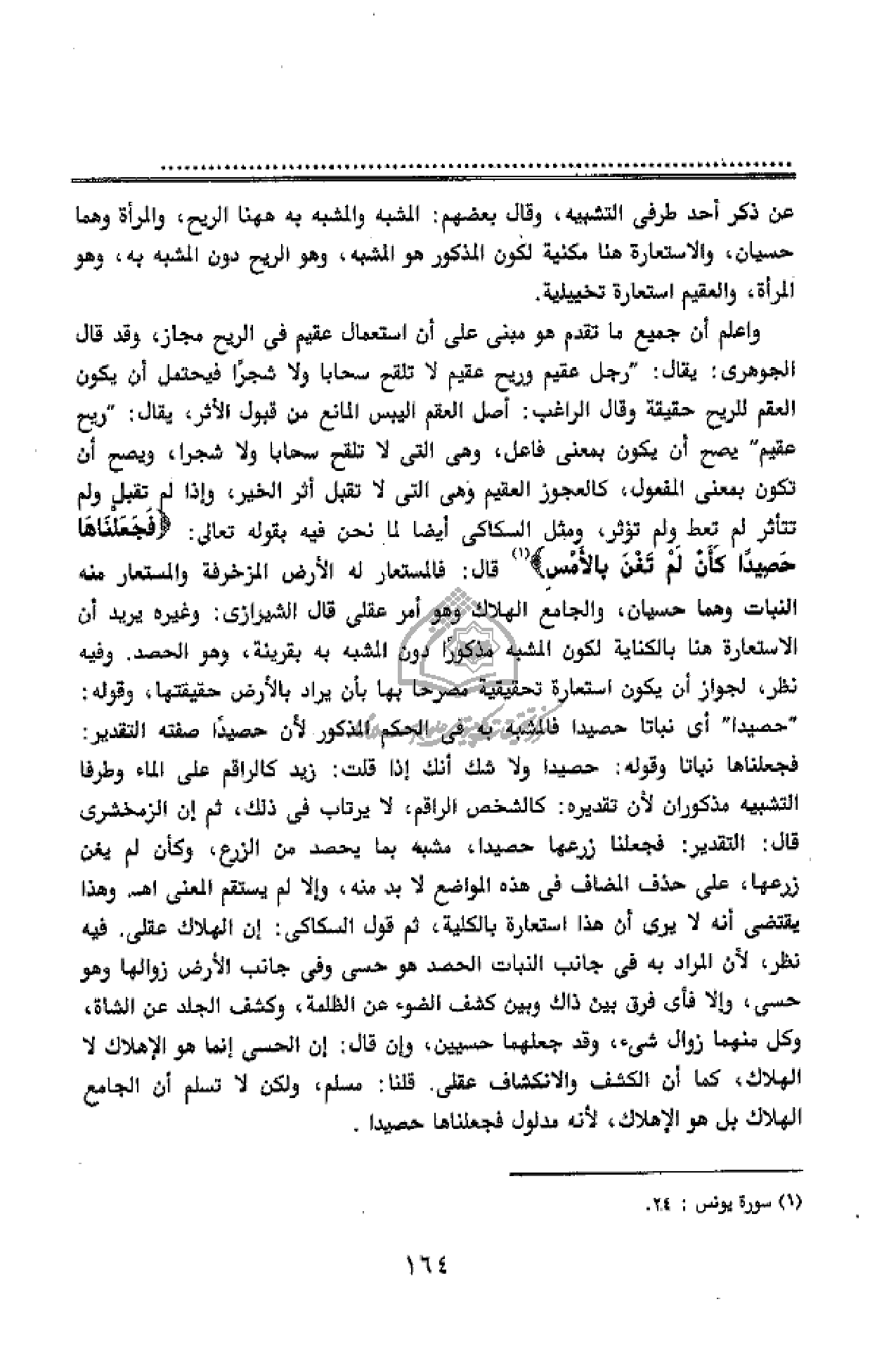 فجعلناها نباتا وقوله: حصيدا ولا شك أنك إذا قلت: زيد كالراقم على الماء وطرفا التشبيه مذكوران لأن تقديره: كالشخص الراقم، لا يرتاب فى ذلك، ثم إن الزمخشرى قال: التقدير: فجعلنا زرعها حصيدا، مشبه بما يحصد من الزرع، وكأن لم يغن زرعها، على حذف المضاف فى هذه المواضع لا بد منه، وإلا لم يستقم المعنى اه. وهذا يقتضى أنه لا يرى أن هذا استعارة بالكلية، ثم قول السكاكى: إن الهلاك عقلى. فيه نظر، لأن المراد به فى جانب النبات الحصد هو حسى وفى جانب الأرض زوالها وهو حسى، وإلا فأى فرق بين ذاك وبين كشف الضوء عن الظلمة، وكشف الجلد عن الشاة، وكل منهما زوال شئ، وقد جعلهما حسيين، وإن قال: إن الحسى إنما هو الإهلاك لا الهلاك، كما أن الكشف والانكشاف عقلى. قلنا: مسلم، ولكن لا تسلم أن الجامع الهلاك بل هو الإهلاك، لأنه مدلول فجعلناها حصيدا.