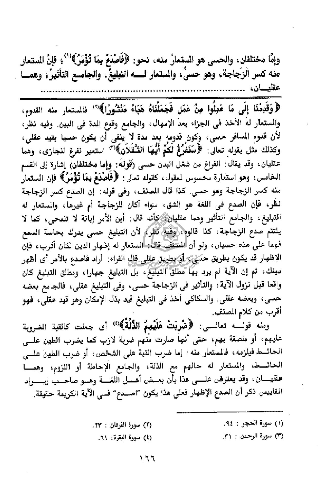 ومنه قوله تعالى: ضُرِبَتْ عَلَيْهِمُ الذِّلَّةُ (¬4) أى جعلت كالقبة المضروبة عليهم، أو ملصقة بهم، حتى أنها صارت منهم ضربة لازب كما يضرب الطين على الحائط فيلزمه، فالمستعار منه: إما ضرب القبة على الشخص، أو ضرب الطين على الحائط، والمستعار له حالهم مع الذلة، والجامع الإحاطة أو اللزوم، وهما عقليان، وقد يعترض على هذا بأن بعض أهل اللغة وهو صاحب إيراد المقاييس ذكر أن الصدع الإظهار فعلى هذا يكون" اصدع" فى الآية الكريمة حقيقة.
