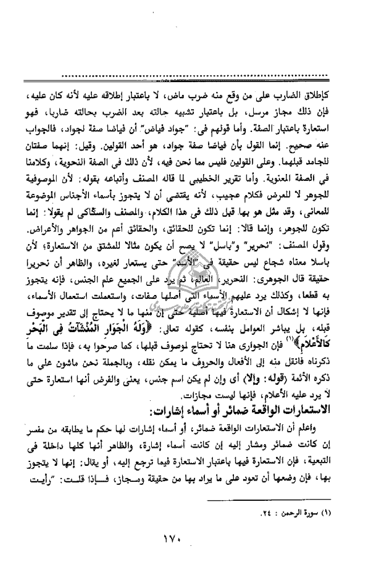 حقيقة فى" الأسد" حتى يستعار لغيره، والظاهر أن نحريرا حقيقة قال الجوهرى: النحرير، العالم، ثم يرد على الجميع علم الجنس، فإنه يتجوز به قطعا، وكذلك يرد عليهم الأسماء التى أصلها صفات، واستعملت استعمال الأسماء، فإنها لا إشكال أن الاستعارة فيها أصلية حتى إن منها ما لا يحتاج إلى تقدير موصوف قبله، بل يباشر العوامل بنفسه، كقوله تعالى: وَلَهُ الْجَوارِ الْمُنْشَآتُ فِي الْبَحْرِ كَالْأَعْلامِ (¬1) فإن الجوارى هنا لا تحتاج لموصوف قبلها، كما صرحوا به، فإذا سلمت ما ذكرناه فانقل منه إلى الأفعال والحروف ما يمكن نقله، وبالجملة نحن ماشون على ما ذكره الأئمة (قوله: وإلا) أى وإن لم يكن اسم جنس، يعنى والفرض أنها استعارة حتى لا يرد عليه الأعلام، فإنها ليست مجازات.