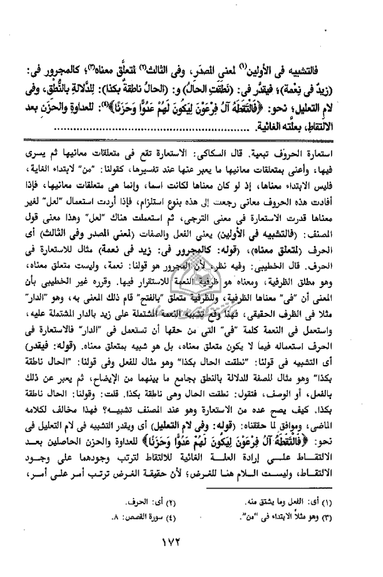 الحقيقى، فهنا وقع تشبيه النعمة المشتملة على زيد بالدار المشتملة عليه، واستعمل فى النعمة كلمة" فى" التى من حقها أن تستعمل فى" الدار" فالاستعارة فى الحرف استعماله فيما لا يكون متعلق معناه، بل هو شبيه بمتعلق معناه. (قوله: فيقدر) أى التشبيه فى قولنا:" نطقت الحال بكذا" وهو مثال للفعل وفى قولنا:" الحال ناطقة بكذا" وهو مثال للصفة للدلالة بالنطق بجامع ما بينهما من الإيضاح، ثم يعبر عن ذلك بالفعل، أو الوصف، فتقول: نطقت الحال وهى ناطقة بكذا. قلت: وقولنا: الحال ناطقة بكذا. كيف يصح عده من الاستعارة وهو عند المصنف تشبيه؟ فهذا مخالف لكلامه الماضى، وموافق لما حققناه: (قوله: وفى لام التعليل) أى ويقدر التشبيه فى لام التعليل فى نحو: فَالْتَقَطَهُ آلُ فِرْعَوْنَ لِيَكُونَ لَهُمْ عَدُوًّا وَحَزَناً للعداوة والحزن الحاصلين بعد الالتقاط على إرادة العلة الغائية للالتقاط لترتب وجودهما على وجود الالتقاط، وليست اللام هنا للغرض؛ لأن حقيقة الغرض ترتب أمر على أمر،