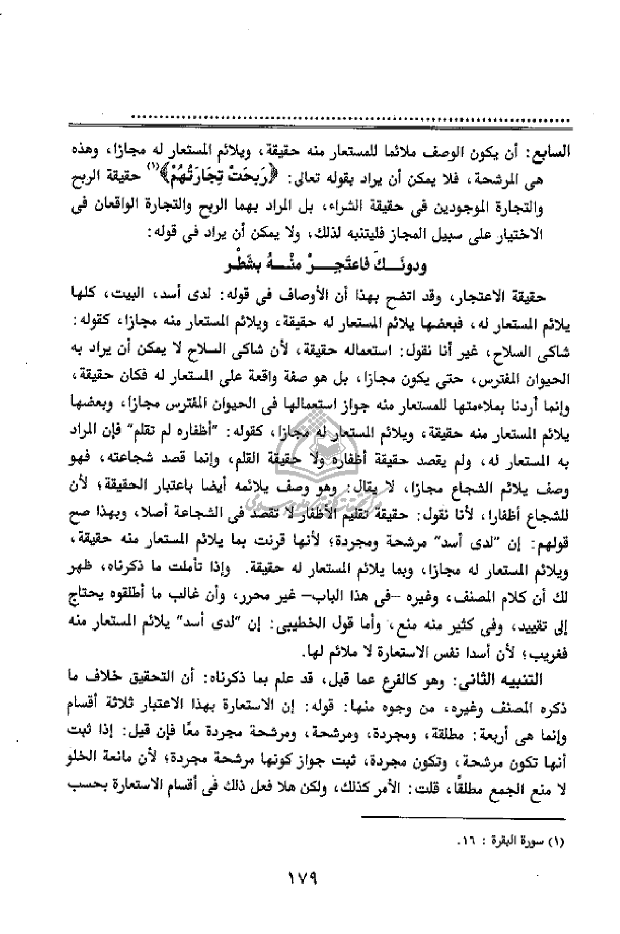 حقيقة الاعتجار، وقد اتضح بهذا أن الأوصاف فى قوله: لدى أسد، البيت، كلها يلائم المستعار له، فبعضها يلائم المستعار له حقيقة، ويلائم المستعار منه مجازا، كقوله: