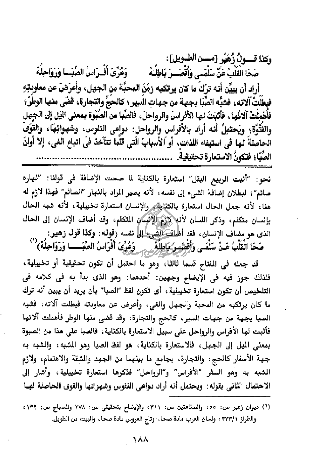 قد جعله فى المفتاح قسما ثالثا، وهو ما احتمل أن تكون تحقيقية أو تخييلية، فلذلك جوز فيه فى الإيضاح وجهين: أحدهما: وهو الذى بدأ به فى كلامه فى التلخيص أن تكون استعارة تخييلية، أى تكون لفظ" الصبا" بأن يريد أن يبين أنه ترك ما كان يرتكبه من المحبة والجهل والغى، وأعرض عن معاودته فبطلت آلاته، فشبه الصبا بجهة من جهات المسير، كالحج والتجارة، وقد قضى منها الوطر فأهملت آلاتها فأثبت لها الأفراس والرواحل على سبيل الاستعارة بالكناية، فالصبا على هذا من الصبوة بمعنى الميل إلى الجهل، فالاستعارة بالكناية، هو لفظ الصبا وهو المشبه، والمشبه به جهة الأسفار كالحج، والتجارة، بجامع ما بينهما من الجهد والمشقة والاهتمام، ولازم المشبه به وهو السفر" الأفراس" و" الرواحل" فذكرها استعارة تخييلية، وأشار إلى الاحتمال الثانى بقوله: ويحتمل أنه أراد دواعى النفوس وشهواتها والقوى الحاصلة لها