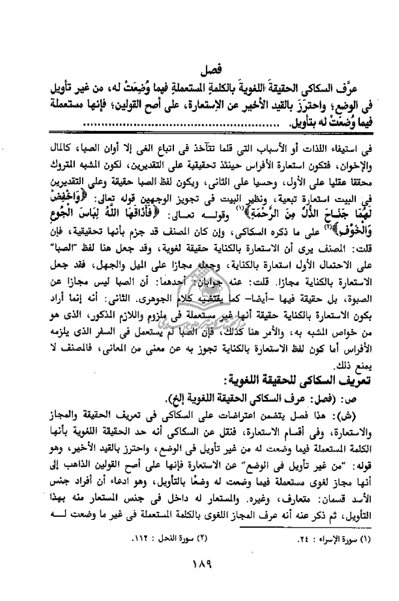 تعريف السكاكى للحقيقة اللغوية: ص: (فصل: عرف السكاكى الحقيقة اللغوية إلخ).