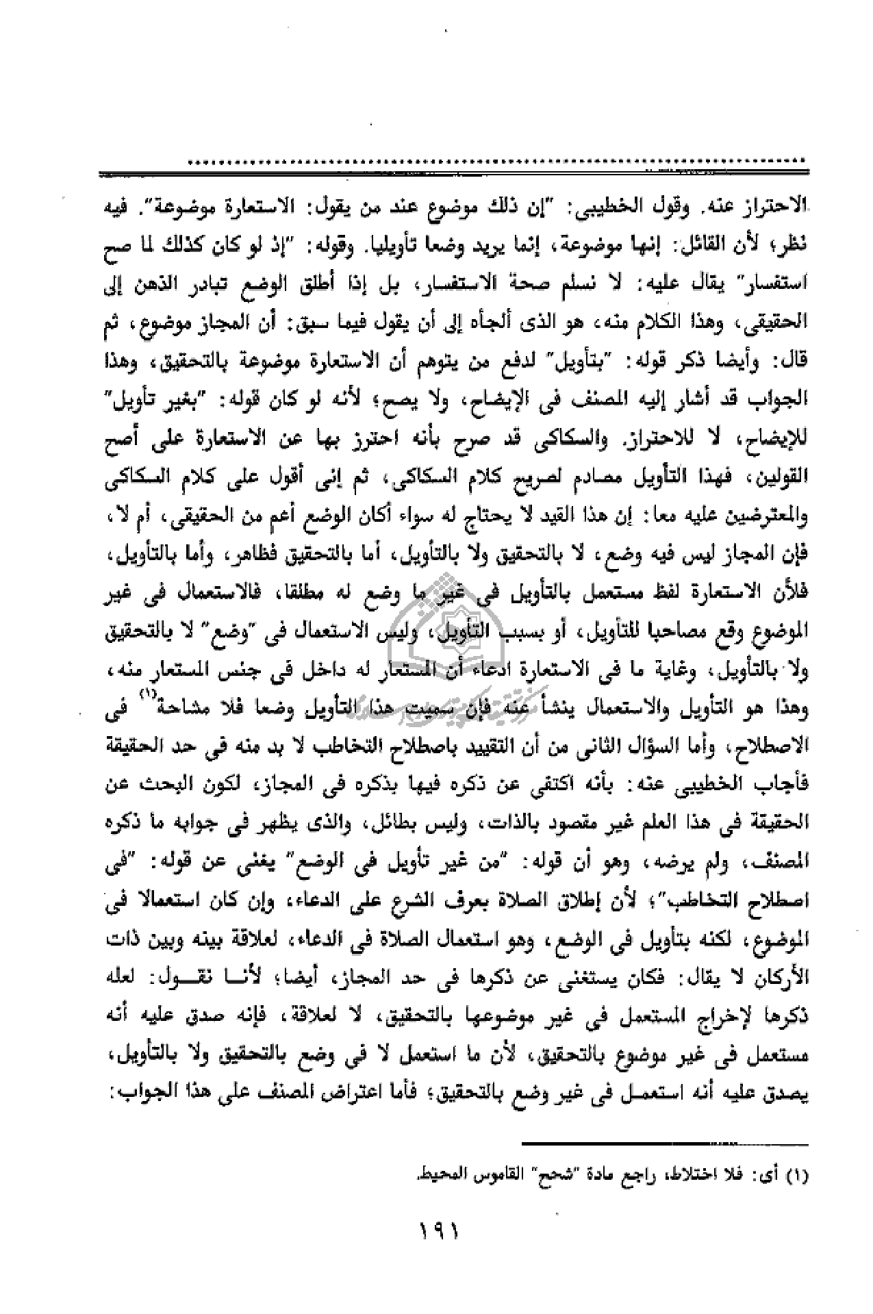 الاحتراز عنه. وقول الخطيبى:" إن ذلك موضوع عند من يقول: الاستعارة موضوعة". فيه نظر؛ لأن القائل: إنها موضوعة، إنما يريد وضعا تأويليا. وقوله:" إذ لو كان كذلك لما صح استفسار" يقال عليه: لا نسلم صحة الاستفسار، بل إذا أطلق الوضع تبادر الذهن إلى الحقيقى، وهذا الكلام منه، هو الذى ألجأه إلى أن يقول فيما سبق: