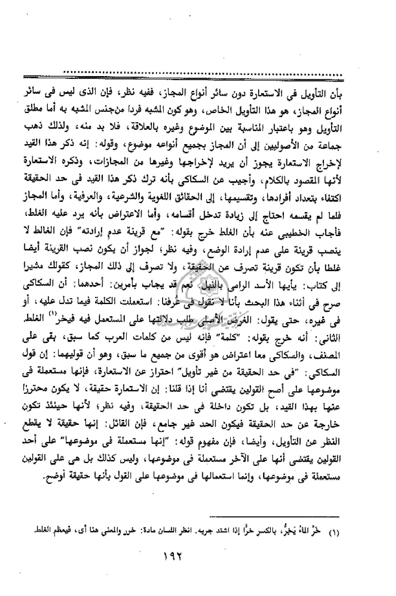 بأن التأويل فى الاستعارة دون سائر أنواع المجاز، ففيه نظر، فإن الذى ليس فى سائر أنواع المجاز، هو هذا التأويل الخاص، وهو كون المشبه فردا من جنس المشبه به أما مطلق التأويل وهو باعتبار المناسبة بين الموضوع وغيره بالعلاقة، فلا بد منه، ولذلك ذهب جماعة من الأصوليين إلى أن المجاز بجميع أنواعه موضوع، وقوله: إنه ذكر هذا القيد لإخراج الاستعارة يجوز أن يريد لإخراجها وغيرها من المجازات، وذكره الاستعارة لأنها المقصود بالكلام، وأجيب عن السكاكى بأنه ترك ذكر هذا القيد فى حد الحقيقة اكتفاء بتعداد أفرادها، وتقسيمها، إلى