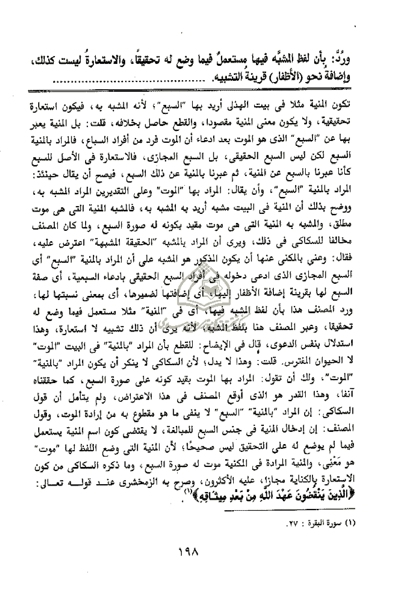 تكون المنية مثلا فى بيت الهذلى أريد بها" السبع"؛ لأنه المشبه به، فيكون استعارة تحقيقية، ولا يكون معنى المنية مقصودا، والقطع حاصل بخلافه، قلت: بل المنية يعبر بها عن" السبع" الذى هو الموت بعد ادعاء أن الموت فرد من أفراد السباع، فالمراد بالمنية السبع لكن ليس السبع الحقيقى، بل السبع المجازى، فالاستعارة فى الأصل للسبع كأنا عبرنا بالسبع عن المنية، ثم عبرنا بالمنية عن ذلك السبع، فيصح أن يقال حينئذ: