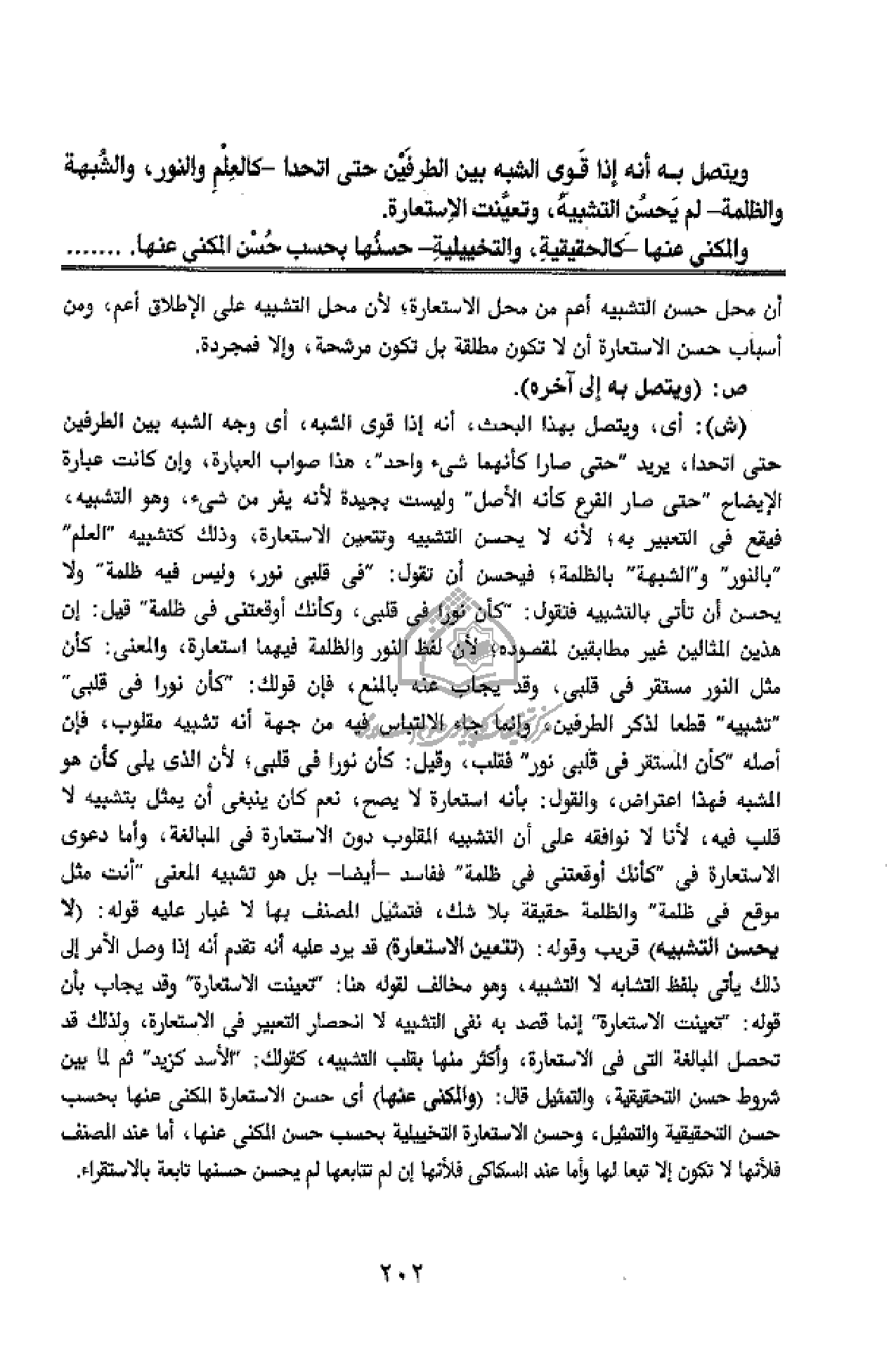 (ش): أى، ويتصل بهذا البحث، أنه إذا قوى الشبه، أى وجه الشبه بين الطرفين حتى اتحدا، يريد" حتى صارا كأنهما شئ واحد"، هذا صواب العبارة، وإن كانت عبارة الإيضاح" حتى صار الفرع كأنه الأصل" وليست بجيدة لأنه يفر من شئ، وهو التشبيه، فيقع فى التعبير به؛ لأنه لا يحسن التشبيه وتتعين الاستعارة، وذلك كتشبيه" العلم"" بالنور" و" الشبهة" بالظلمة؛ فيحسن أن تقول:" فى قلبى نور، وليس فيه ظلمة" ولا يحسن أن تأتى بالتشبيه فتقول:" كأن نورا فى قلبى، وكأنك أوقعتنى فى ظلمة" قيل: إن هذين المثالين غير مطابقين لمقصوده؛ لأن لفظ النور والظلمة فيها استعارة، والمعنى: كأن مثل النور مستقر فى قلبى، وقد يجاب عنه بالمنع، فإن قولك:" كأن نورا فى قلبى"" تشبيه" قطعا لذكر الطرفين، وإنما جاء الالتباس فيه من جهة أنه تشبيه مقلوب، فإن أصله" كأن المستقر فى قلبى نور" فقلب، وقيل: كأن نورا فى قلبى؛ لأن الذى يلى كأن هو المشبه فهذا اعتراض، والقول: بأنه استعارة لا يصح، نعم كان ينبغى أن يمثل بتشبيه لا قلب فيه، لأنا لا نوافقه على أن التشبيه المقلوب دون الاستعارة فى المبالغة، وأما دعوى الاستعارة فى" كأنك أوقعتنى فى ظلمة" ففاسد - أيضا - بل هو تشبيه المعنى" أنت مثل موقع فى ظلمة" والظلمة حقيقة بلا شك، فتمثيل المصنف بها لا غبار عليه قوله: (لا يحسن التشبيه) قريب وقوله: (تتعين الاستعارة) قد يرد عليه أنه تقدم أنه إذا وصل الأمر إلى ذلك يأتى بلفظ التشابه لا التشبيه، وهو مخالف