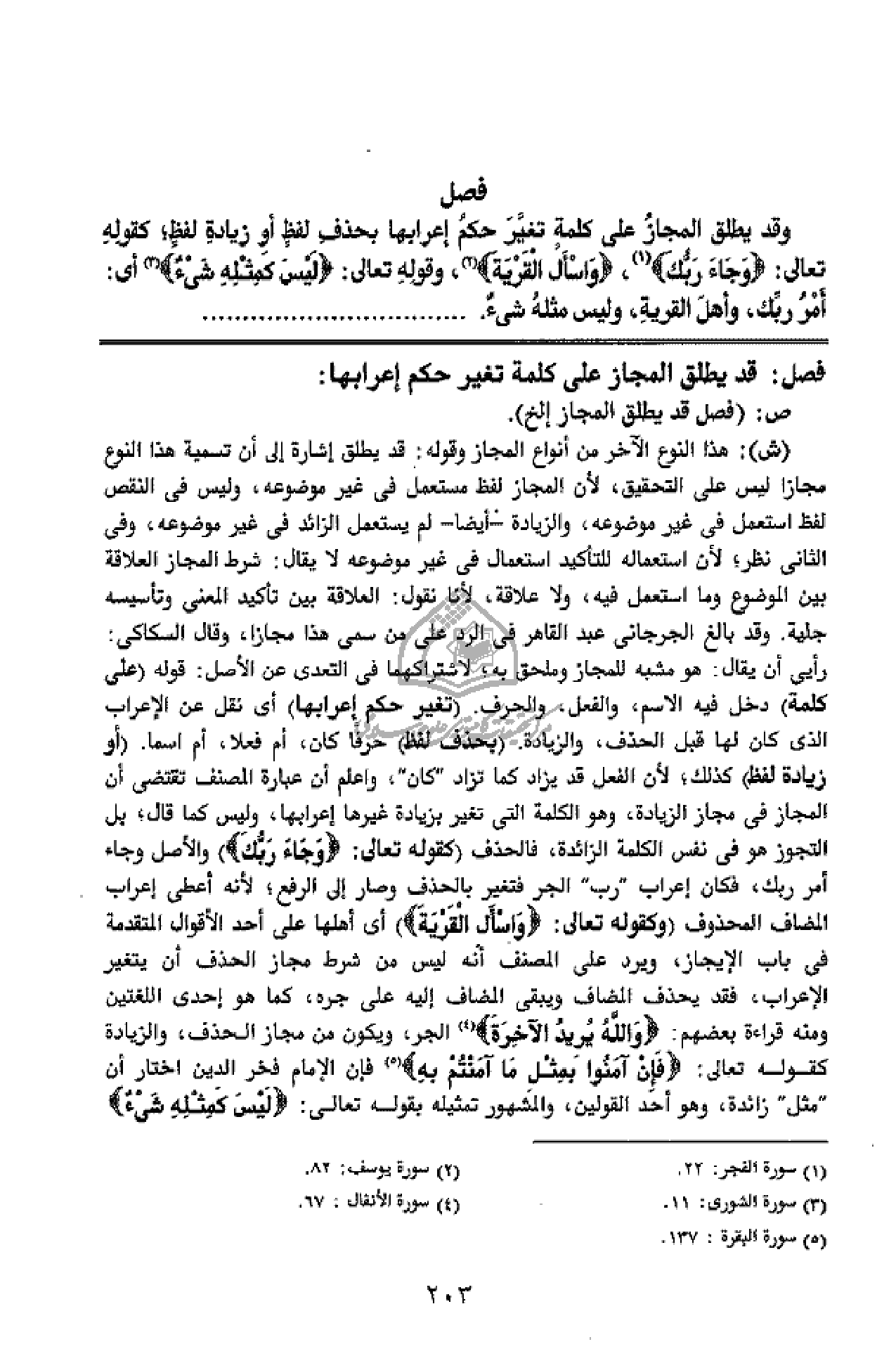 فصل [قد يطلق المجاز على كلمة تغيّر حكم إعرابها بحذف لفظ أو زيادة لفظ]