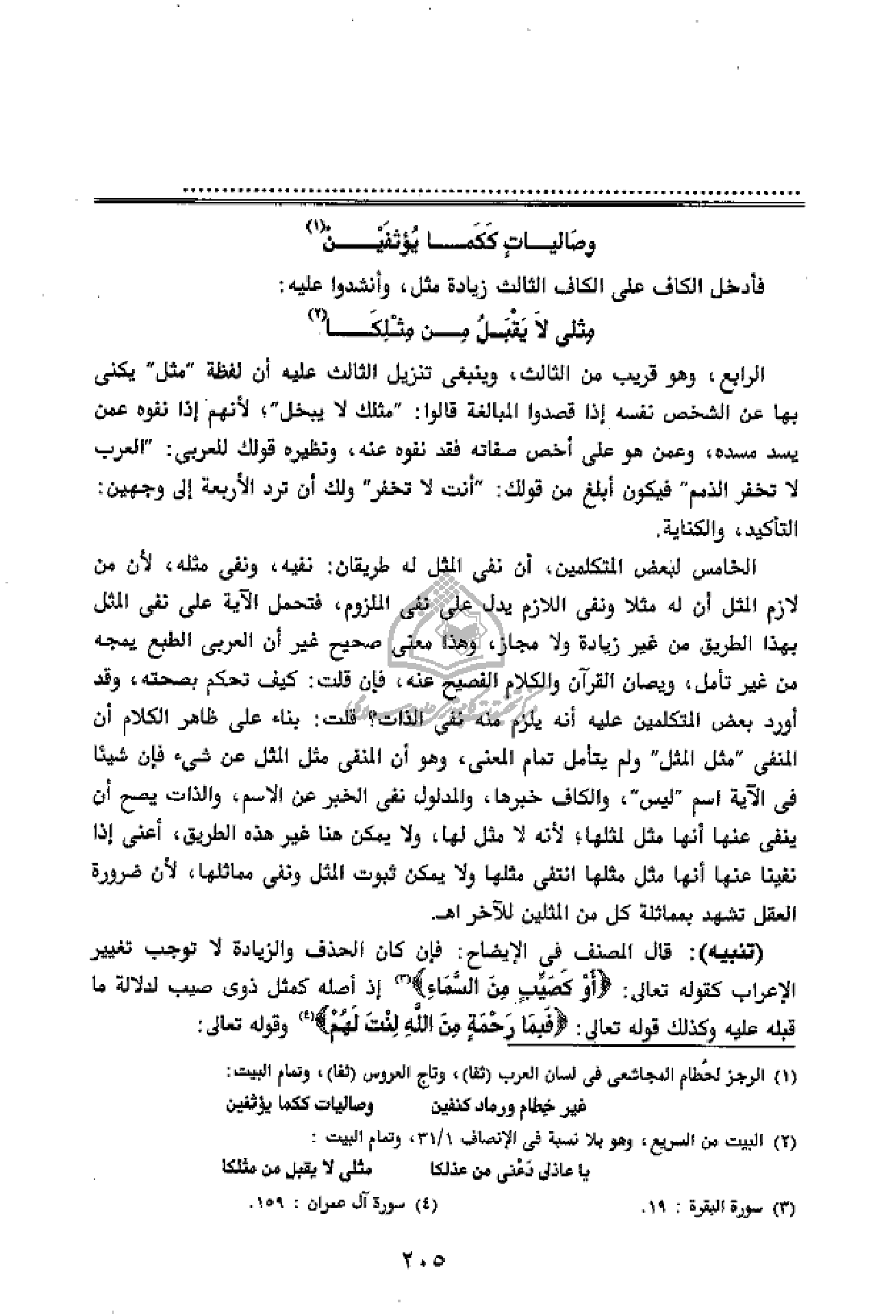 الرابع، وهو قريب من الثالث، وينبغى تنزيل الثالث عليه أن لفظة" مثل" يكنى بها عن الشخص نفسه إذا قصدوا المبالغة قالوا:" مثلك لا يبخل"؛ لأنهم إذا نفوه عمن يسد مسده، وعمن هو على أخص صفاته فقد نفوه عنه، ونظيره قولك للعربى:" العرب لا تخفر الذمم" فيكون أبلغ من قولك:" أنت لا تخفر" ولك أن ترد الأربعة إلى وجهين: