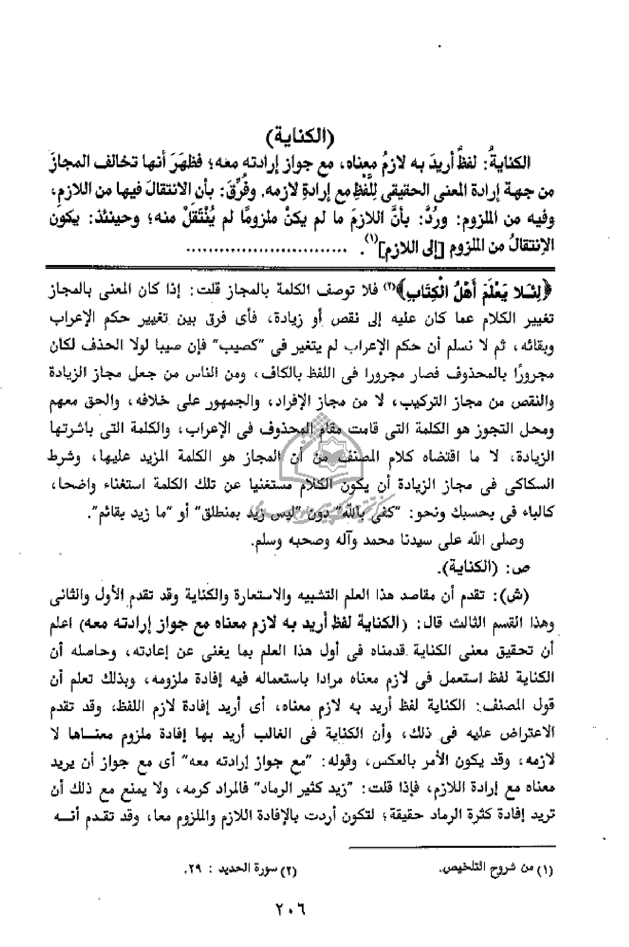 لِئَلَّا يَعْلَمَ أَهْلُ الْكِتابِ (¬2) فلا توصف الكلمة بالمجاز قلت: إذا كان المعنى بالمجاز تغيير الكلام عما كان عليه إلى نقص أو زيادة، فأى فرق بين تغيير حكم الإعراب وبقائه، ثم لا نسلم أن حكم الإعراب لم يتغير فى" كصيب" فإن صيبا لولا الحذف لكان مجرورا بالمحذوف فصار مجرورا فى اللفظ بالكاف، ومن الناس من جعل مجاز الزيادة والنقص من مجاز التركيب، لا من مجاز الإفراد، والجمهور على خلافه، والحق معهم ومحل التجوز هو الكلمة التى قامت مقام المحذوف فى الإعراب، والكلمة التى باشرتها الزيادة، لا ما اقتضاه كلام المصنف من أن المجاز هو الكلمة المزيد عليها، وشرط السكاكى فى مجاز الزيادة أن يكون الكلام مستغنيا عن تلك الكلمة استغناء واضحا، كالباء فى بحسبك ونحو:" كفى بالله" دون" ليس زيد بمنطلق" أو" ما زيد بقائم".