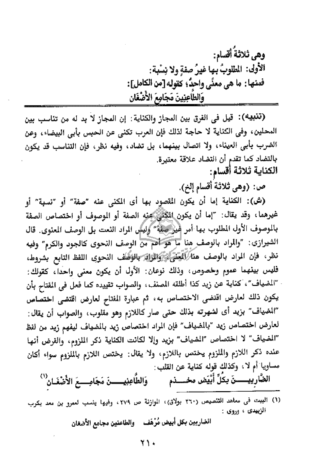 (ش): الكناية إما أن يكون المقصود بها أى المكنى عنه" صفة" أو" نسبة" أو غيرهما، وقد يقال:" إما أن يكون المكنى عنه الصفة أو الموصوف أو اختصاص الصفة بالموصوف الأول المطلوب بها أمر غير صفة" وليس المراد النعت بل الوصف المعنوى. قال الشيرازى:" والمراد بالوصف هنا ما هو أعم من الوصف النحوى كالجود والكرم" وفيه نظر، فإن المراد بالوصف هنا المعنى، والمراد بالوصف النحوى اللفظ التابع بشروط، فليس بينهما عموم وخصوص، وذلك نوعان: الأول أن يكون معنى واحدا، كقولك: