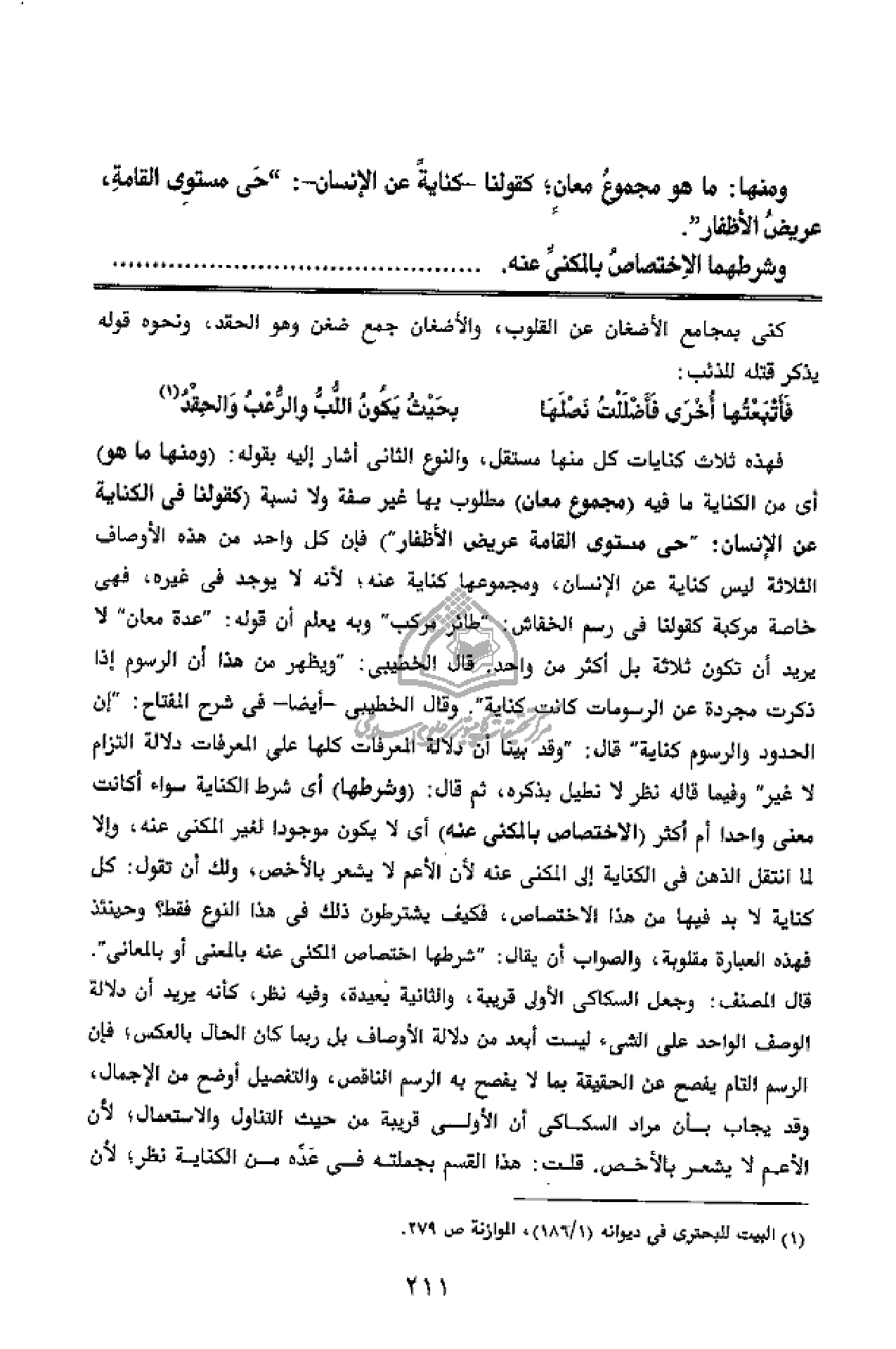 فهذه ثلاث كنايات كل منها مستقل، والنوع الثانى أشار إليه بقوله: (ومنها ما هو) أى من الكناية ما فيه (مجموع معان) مطلوب بها غير صفة ولا نسبة (كقولنا فى الكناية عن الإنسان:" حى مستوى القامة عريض الأظفار") فإن كل واحد من هذه الأوصاف الثلاثة ليس كناية عن الإنسان، ومجموعها كناية عنه؛ لأنه لا يوجد فى غيره، فهى خاصة مركبة كقولنا فى رسم الخفاش:" طائر مركب" وبه يعلم أن قوله:" عدة معان" لا يريد أن تكون ثلاثة بل أكثر من واحد. قال الخطيبى:" ويظهر من هذا أن الرسوم إذا ذكرت مجردة عن الرسومات كانت كناية". وقال الخطيبى - أيضا - فى شرح المفتاح:" إن الحدود والرسوم كناية" قال:" وقد بينا أن دلالة المعرفات كلها على المعرفات دلالة التزام لا غير" وفيما قاله نظر لا نطيل بذكره، ثم قال: (وشرطها) أى شرط الكناية سواء أكانت معنى واحدا أم أكثر (الاختصاص بالمكنى عنه) أى لا يكون موجودا لغير المكنى عنه، وإلا لما انتقل الذهن فى الكناية إلى المكنى عنه لأن الأعم لا يشعر بالأخص، ولك أن تقول: كل كناية لا بد فيها من هذا الاختصاص، فكيف يشترطون ذلك فى هذا النوع فقط؟ وحينئذ فهذه العبارة مقلوبة، والصواب أن يقال:" شرطها اختصاص المكنى عنه بالمعنى أو بالمعانى".