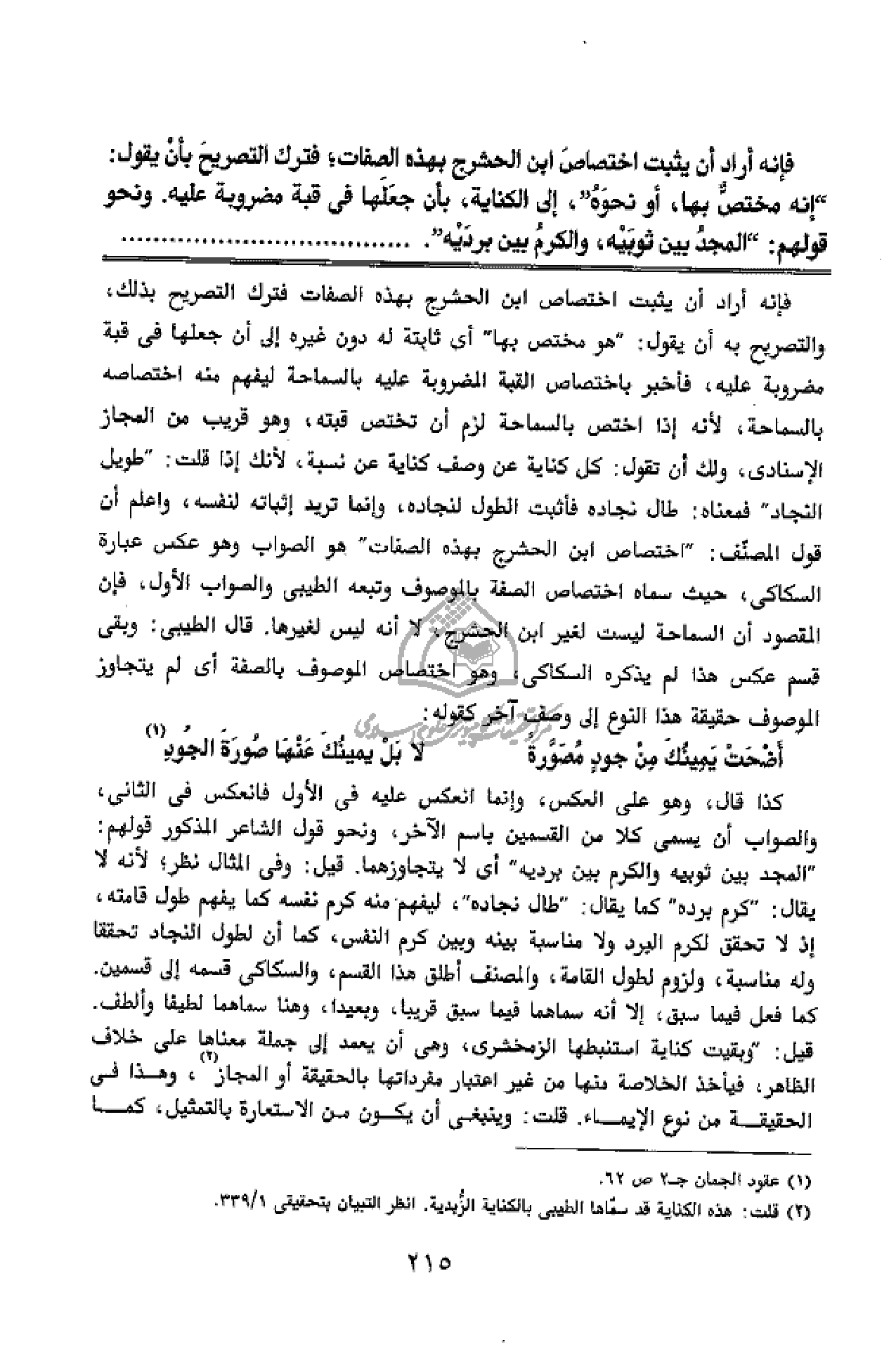 فإنه أراد أن يثبت اختصاص ابن الحشرج بهذه الصفات فترك التصريح بذلك، والتصريح به أن يقول:" هو مختص بها" أى ثابتة له دون غيره إلى أن جعلها فى قبة مضروبة عليه، فأخبر باختصاص القبة المضروبة عليه بالسماحة ليفهم منه اختصاصه بالسماحة، لأنه إذا اختص بالسماحة لزم أن تختص قبته، وهو قريب من المجاز الإسنادى، ولك أن تقول: كل كناية عن وصف كناية عن نسبة، لأنك إذا قلت:" طويل النجاد" فمعناه: طال نجاده فأثبت الطول لنجاده، وإنما تريد إثباته لنفسه، واعلم أن قول المصنّف:" اختصاص ابن الحشرج بهذه الصفات" هو الصواب وهو عكس عبارة السكاكى، حيث سماه اختصاص الصفة بالموصوف وتبعه الطيبى والصواب الأول، فإن المقصود أن السماحة ليست لغير ابن الحشرج، لا أنه ليس لغيرها. قال الطيبى: وبقى قسم عكس هذا لم يذكره السكاكى، وهو اختصاص الموصوف بالصفة أى لم يتجاوز الموصوف حقيقة هذا النوع إلى وصف آخر كقوله: